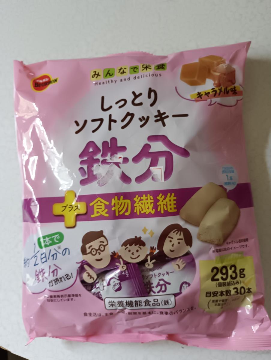お得になっていた商品コーナーで見つけ、鉄分がとれるならと購入しました。パッケージが紫ではなく、ピンクだったので、旧バージョンかなと思います。開封してみると、さすが菓子メーカーさんだなと感心したのが、きちんとしたクッキーです。5センチくらいの長方形で1.5センチくらいの厚みがあります。手に持ちやすいです。鉄分といえばプルーンを思い浮かべるので紫っぽい色かと想像していましたが、普通の小麦色です。食べてみるとソフトクッキーなので食べやすくキャラメルの甘味がよく味わえて美味しいです。白あんを使っているとのことなので、ソフトな食感になるのかなと思います。何の原材料が鉄分なのか分かりませんでしたが、気軽に食べられるし、美味しい商品です。1日1個までというのが、残念というか、もっと食べたくなりますね。美味しくいただきました。