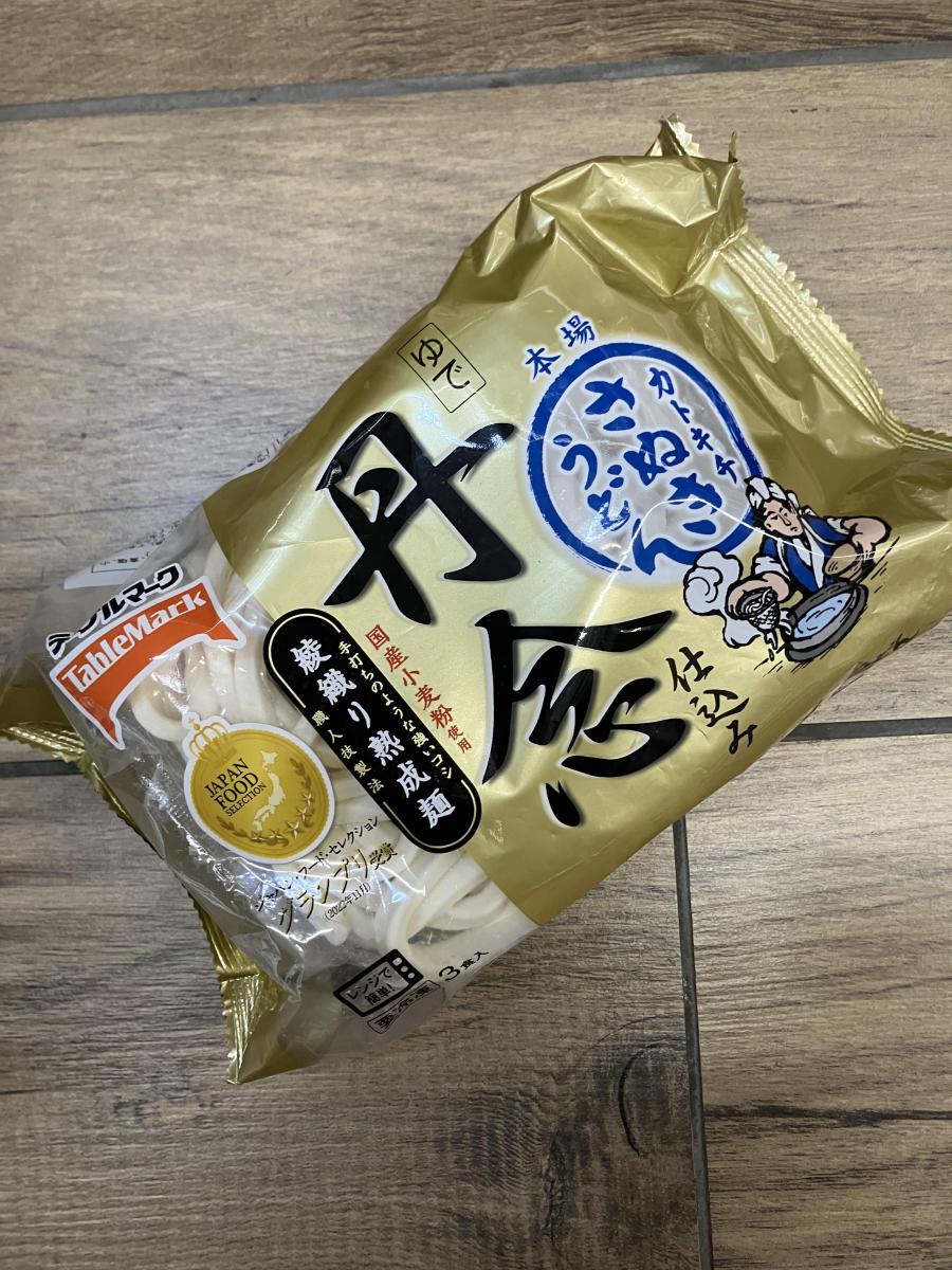 金色に輝くパッケージに『ジャパン・フード・セレクション グランプリ受賞』がふと目に止まり購入してみました。いつも食べ慣れた「カトキチ さぬきうどん」と比べると、見た目は太めの乱切りで良くつゆと絡み、コシと弾力がお店の手打ちうどんのように強い食感でした。