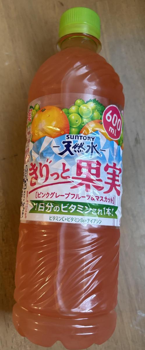 透明なペットボトルから、オレンジというかサーモンピンク色のドリンクが見えていました。サントリーの天然水のドリンクのようで、ピンクグレープフルーツとマスカットの味とのことなので、飲んでみたくなりました。