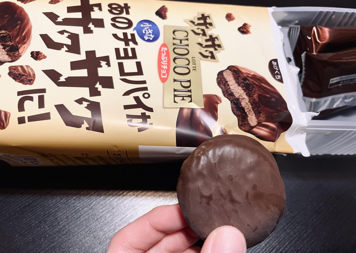 いつものチョコパイが少し小さめになっていて食べやすいです。口に入れるとサクッと軽く、シュワっと溶ける感覚があります。小さめなので手にチョコもつきにくく、食べやすいです。