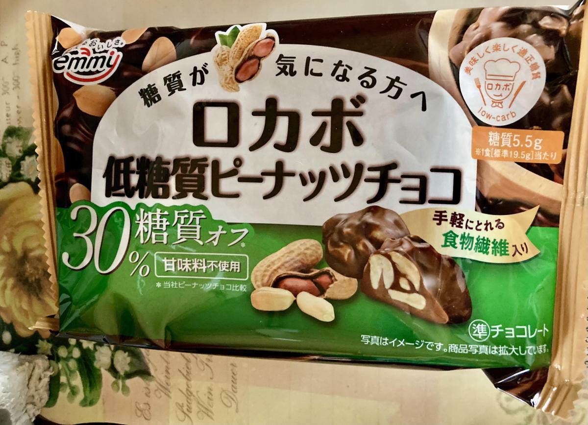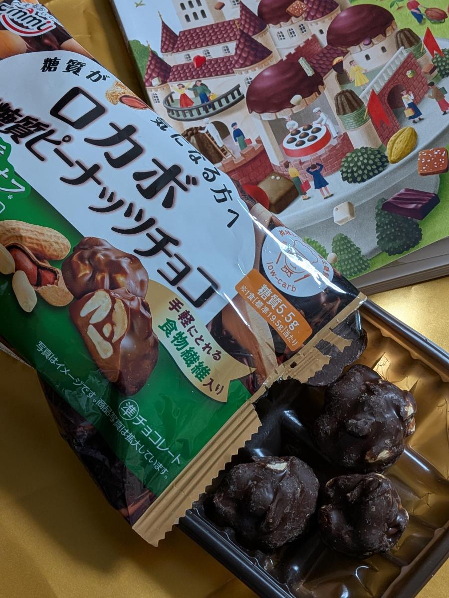 ロカボ 低糖質に目が惹きどんな味か試したくなり購入してみました。袋開けると、大きめサイズのピーナッツ入りチョコレートが入っていました。糖質30%カットですが、チョコレートがかなりの甘さあるチョコレートでした。カリカリなピーナッツは香ばしくて美味しかったです。チョコレートが甘すぎたので、もっと甘さ控えめの方が食べやすいかな。