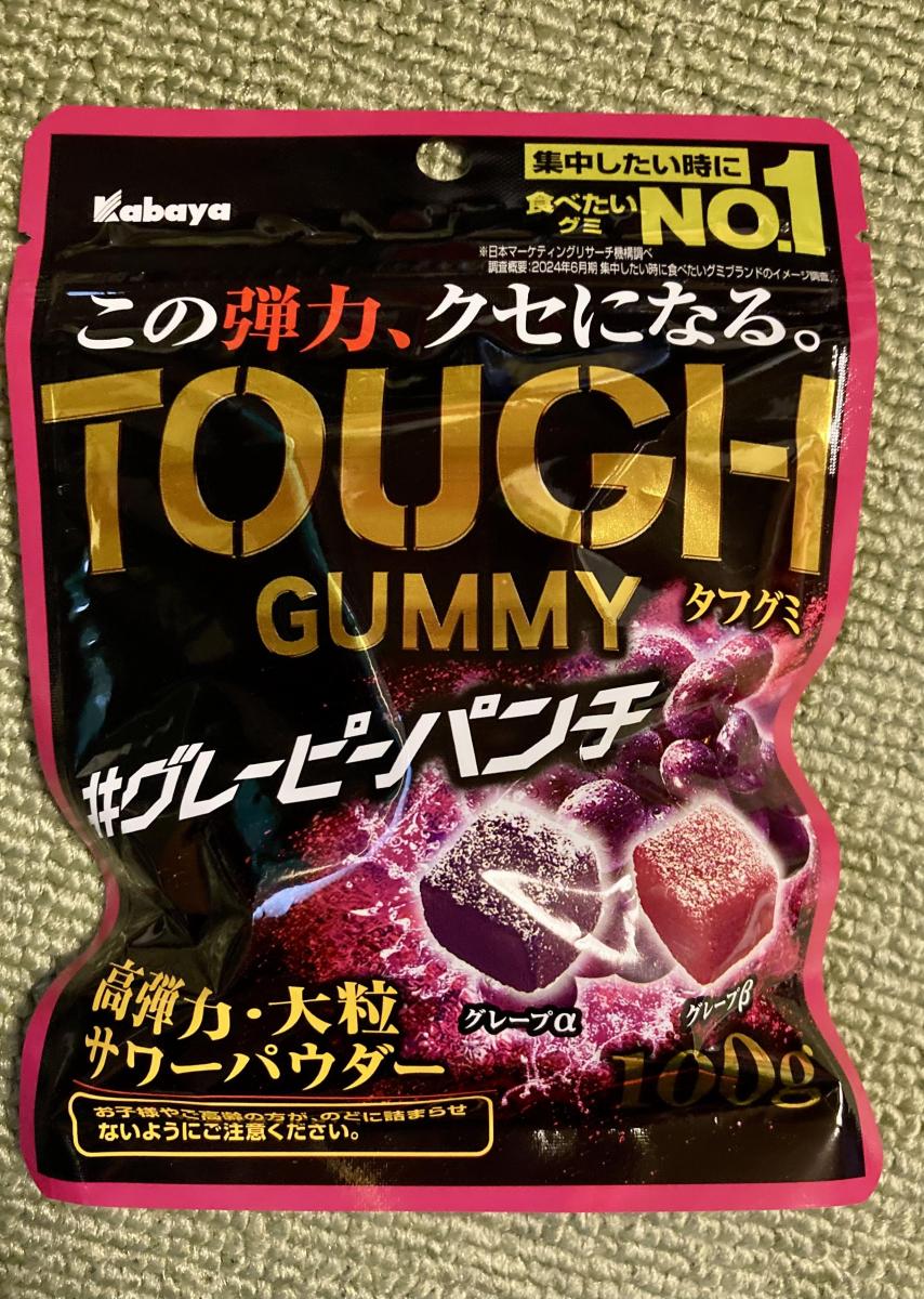 グミのなかで一番好きなグレープ味が二種入っている!私得すぎて購入。以前食べたタフグミがいつだったか記憶にないけどこのタイプ、大粒すぎる。物価高でお菓子が悲しくも小さくなっていく現代に嬉しい大きさ。