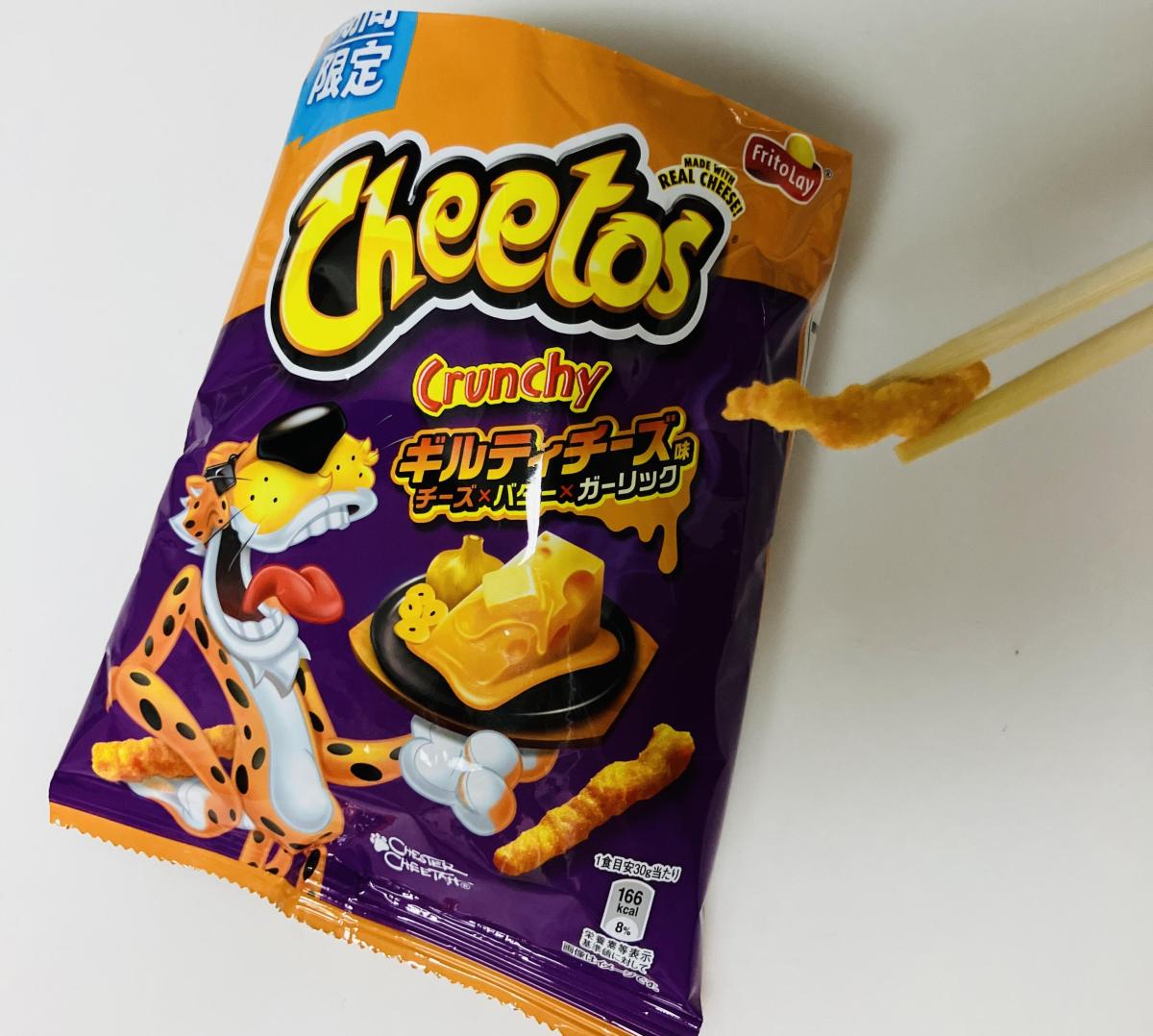 コーンスナックの定番チートス。湖池屋のスコーンとよく似た商品ですね。サクサクの食感とコーンの風味が特徴です。こちらのギルティチーズは、濃厚なチーズとバターにガーリックがよくマッチしていて美味しいです。