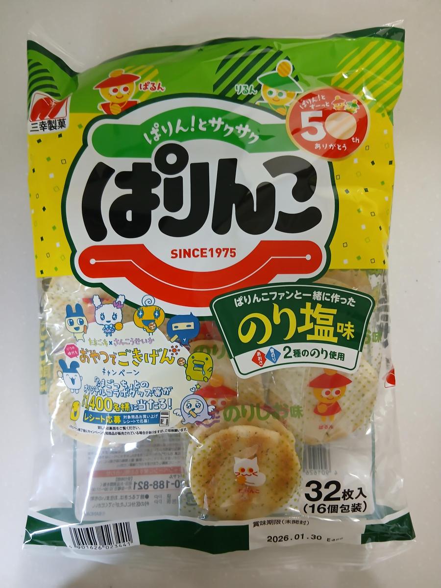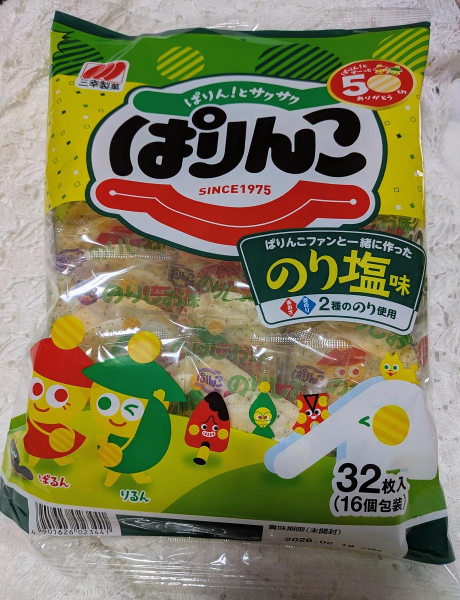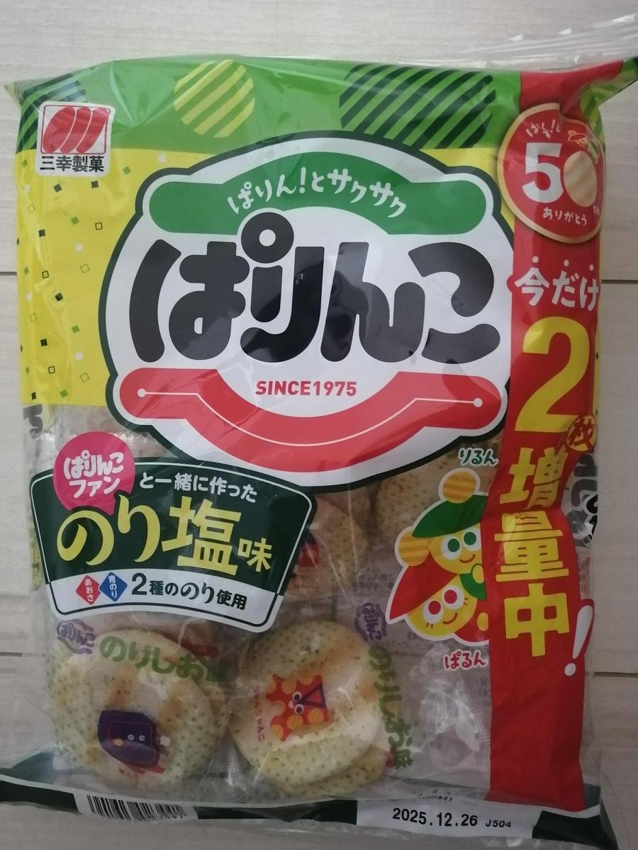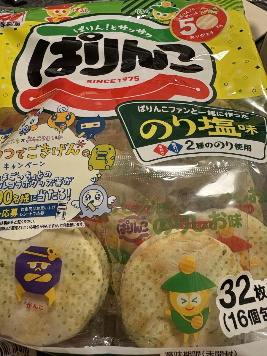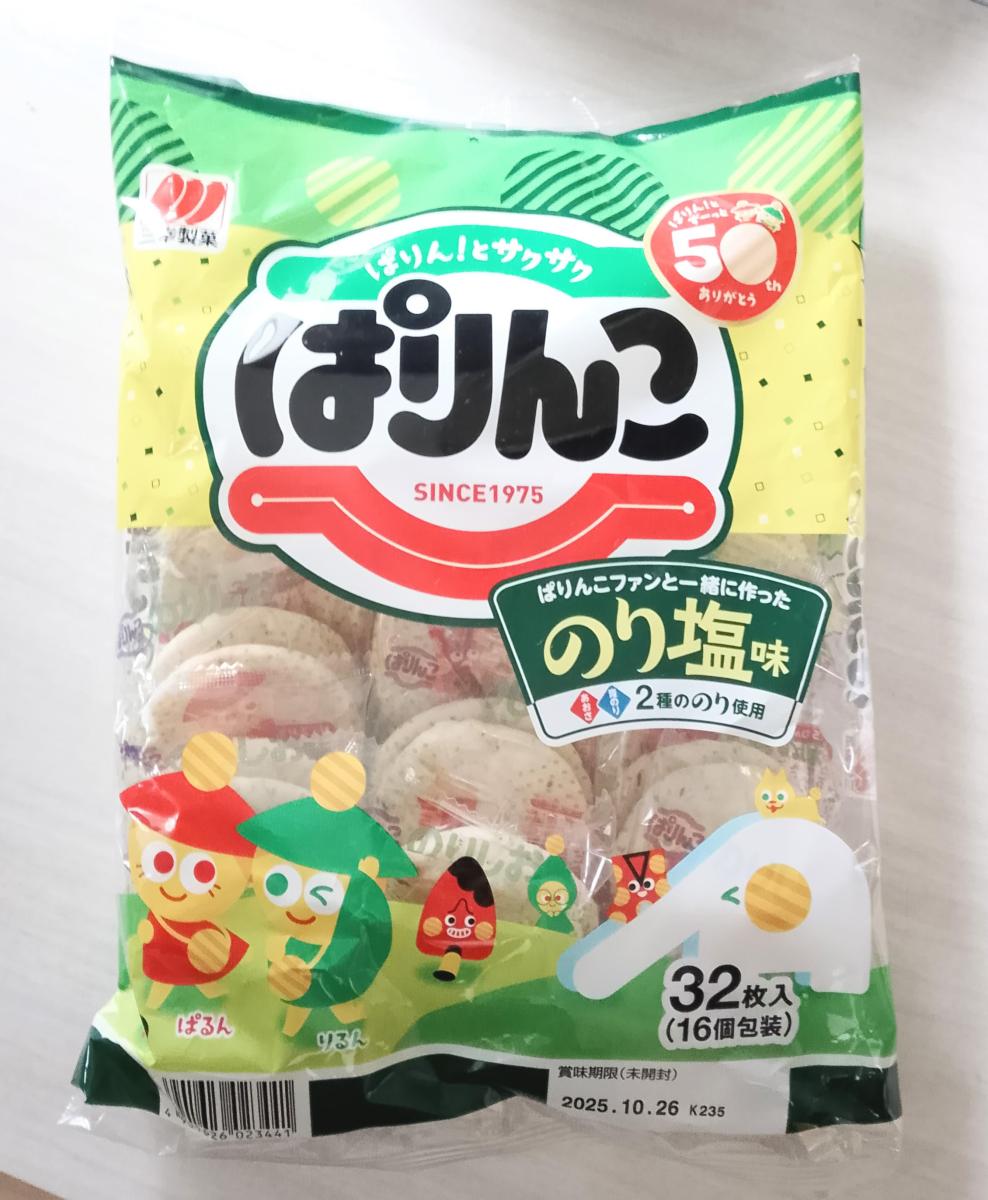 ぱりんこはサクサク軽い食感と食べやすいサイズ感でおやつの定番です。子供たちもぱりんこ大好きです。塩味もいいけど、海苔の風味が良いのり塩味もいいですね。食べ始めると止まらなくなります。コスパも良いし行事事などのバラ菓子としても大活躍です。