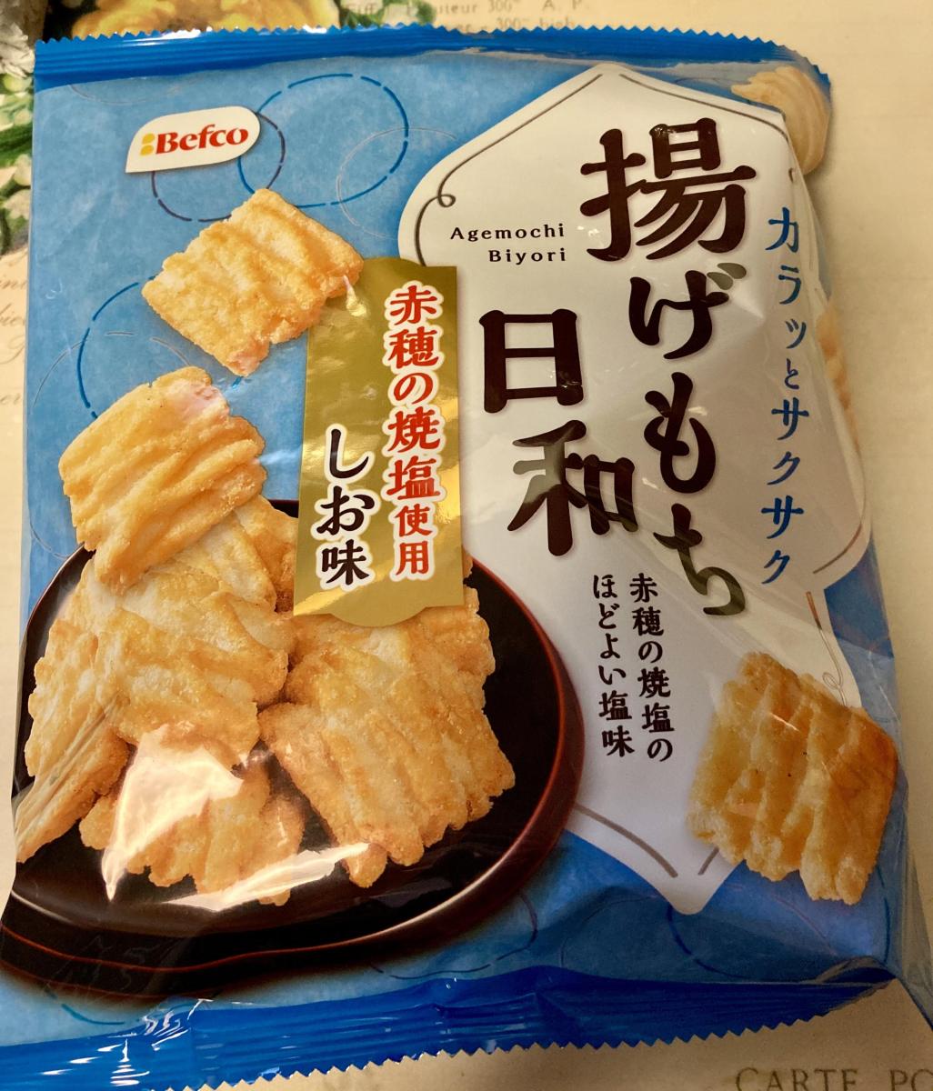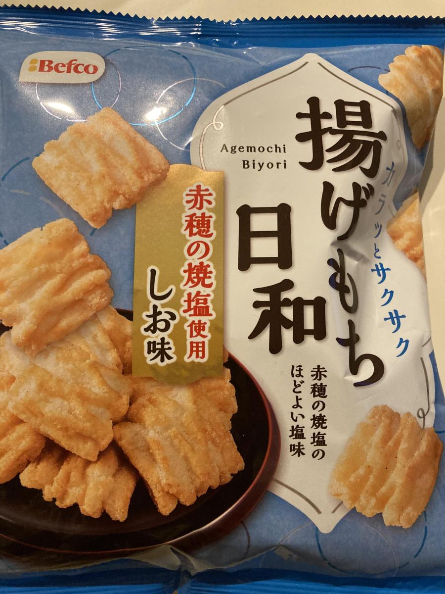 赤穂の焼塩を使った揚げもち日和、サクッとした食感、塩味で食べだすと止まりません。サイズや厚みもほどよい感じで食べやすいです!