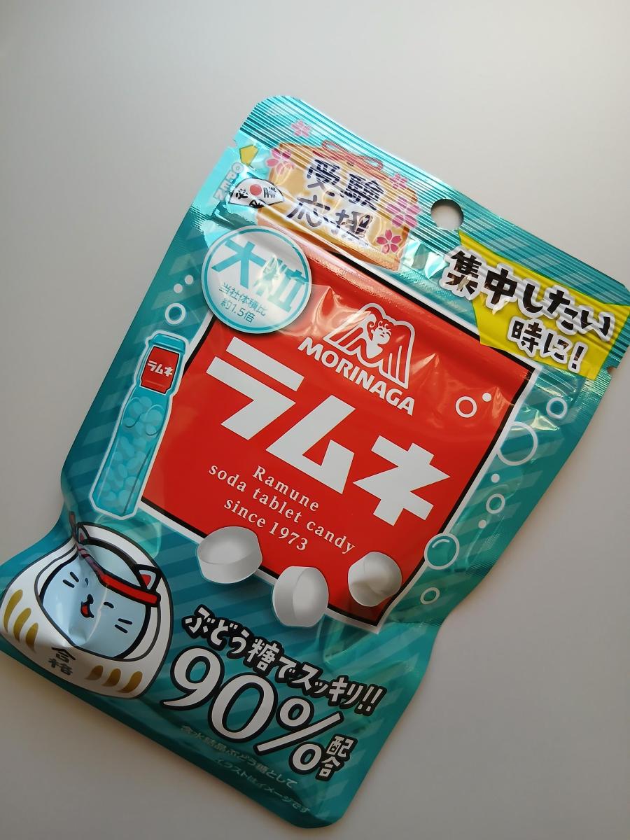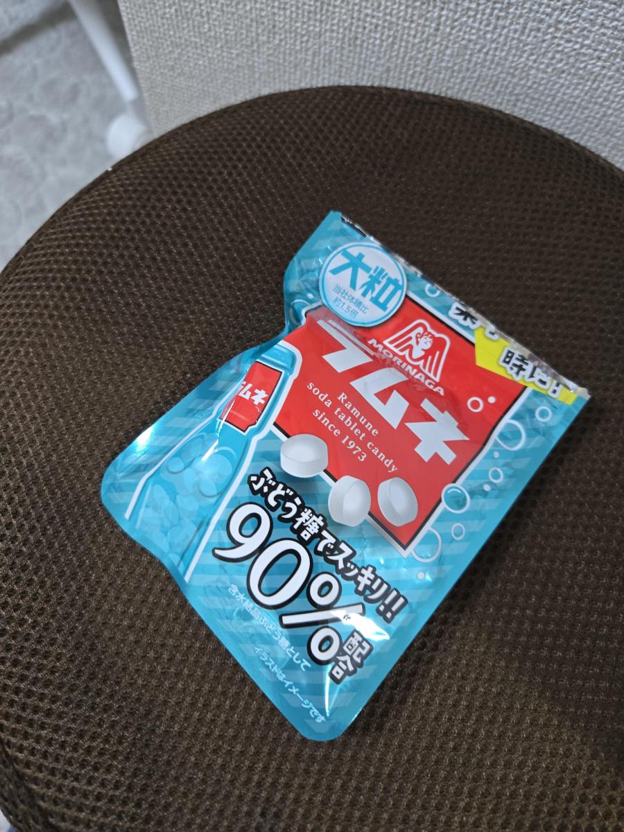 あの森永のラムネが大粒になっていて満足感があります。ブドウ糖が入っており、食べると集中力が上がるので、作業前に食べたりすることもあります。定番の美味しさです。袋を閉められるようになっているので食べ残すことに心配もありません