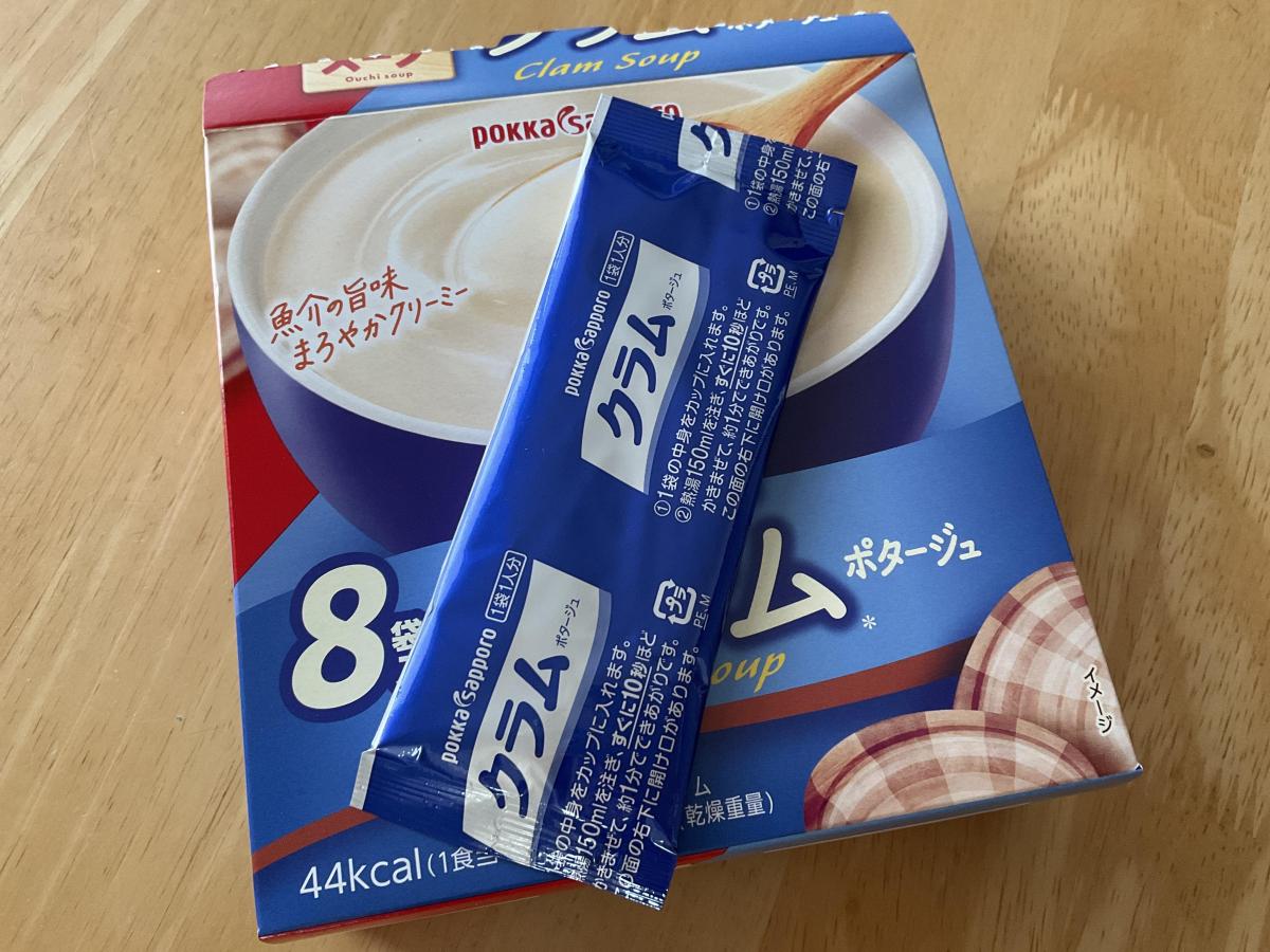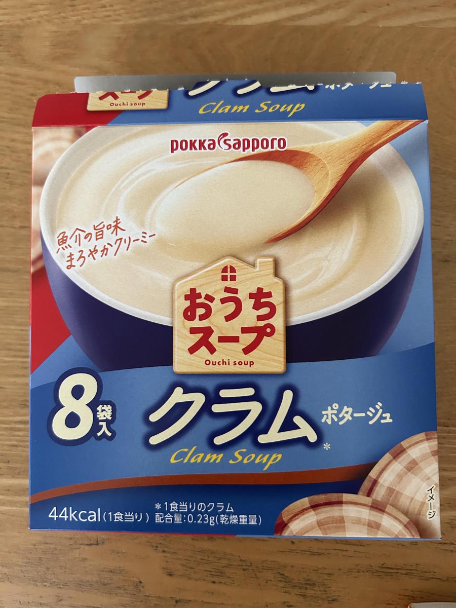 ポッカサッポロのおうちスープ クラムはスーパーで購入しました。具なしのスープでクラムチャウダーの味がしますが、サラサラタイプなので、あっさり飲めます。お湯の量はちゃんと測って入れないと薄くなっちゃうので要注意です。