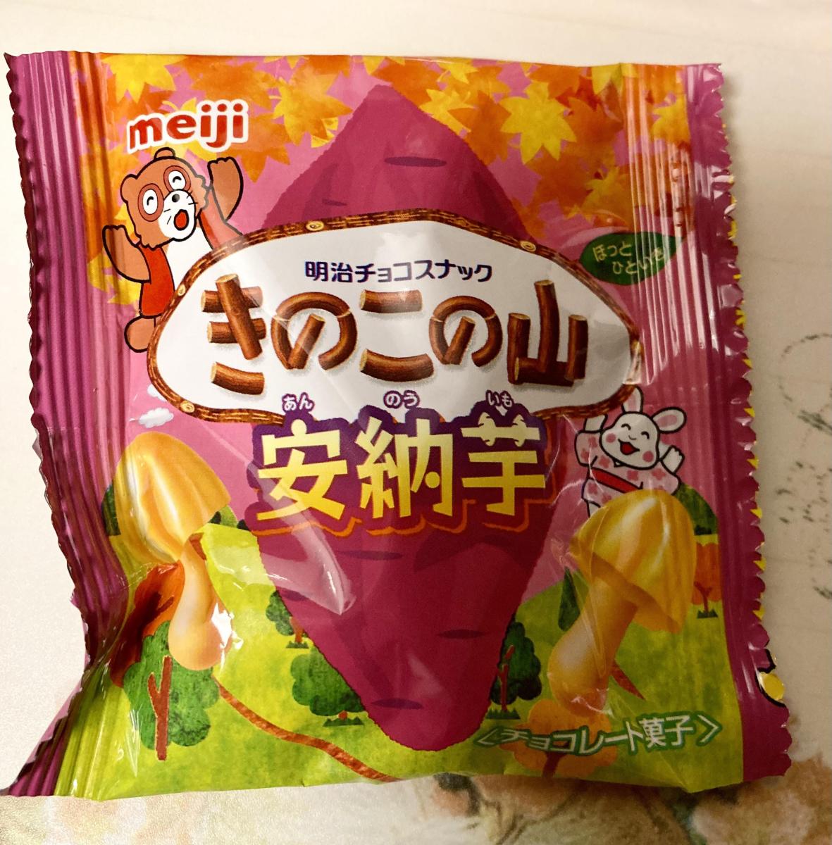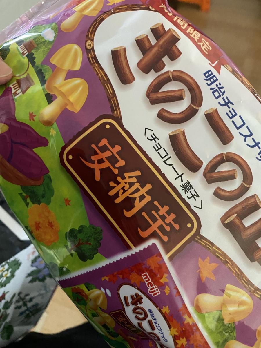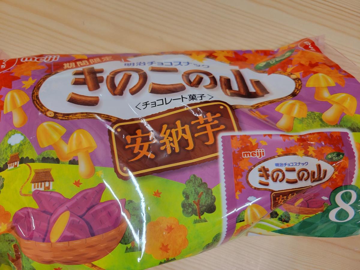 秋らしい紫と黄色の色が華やかなパッケージのきのこの山です。安納芋の味を堪能できるという、楽しいきのこの山です。