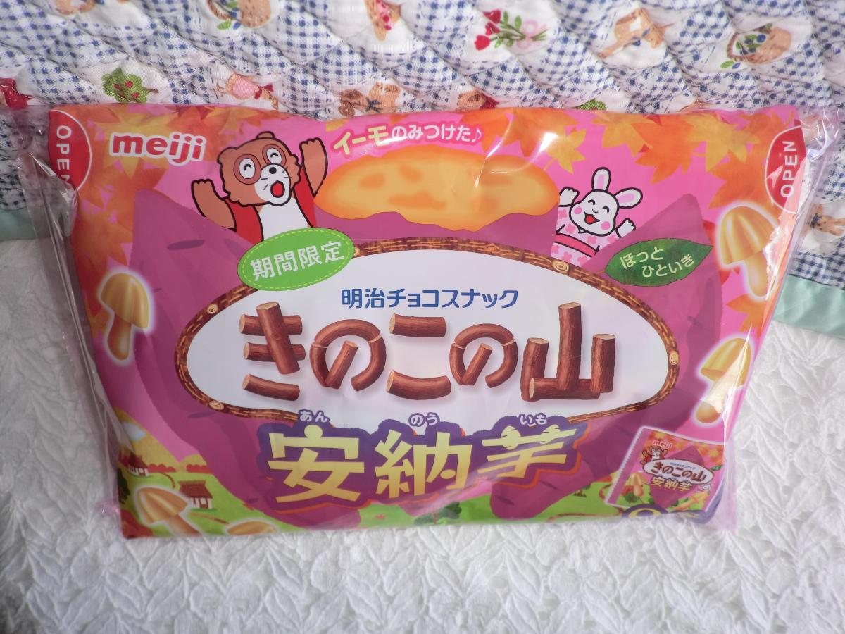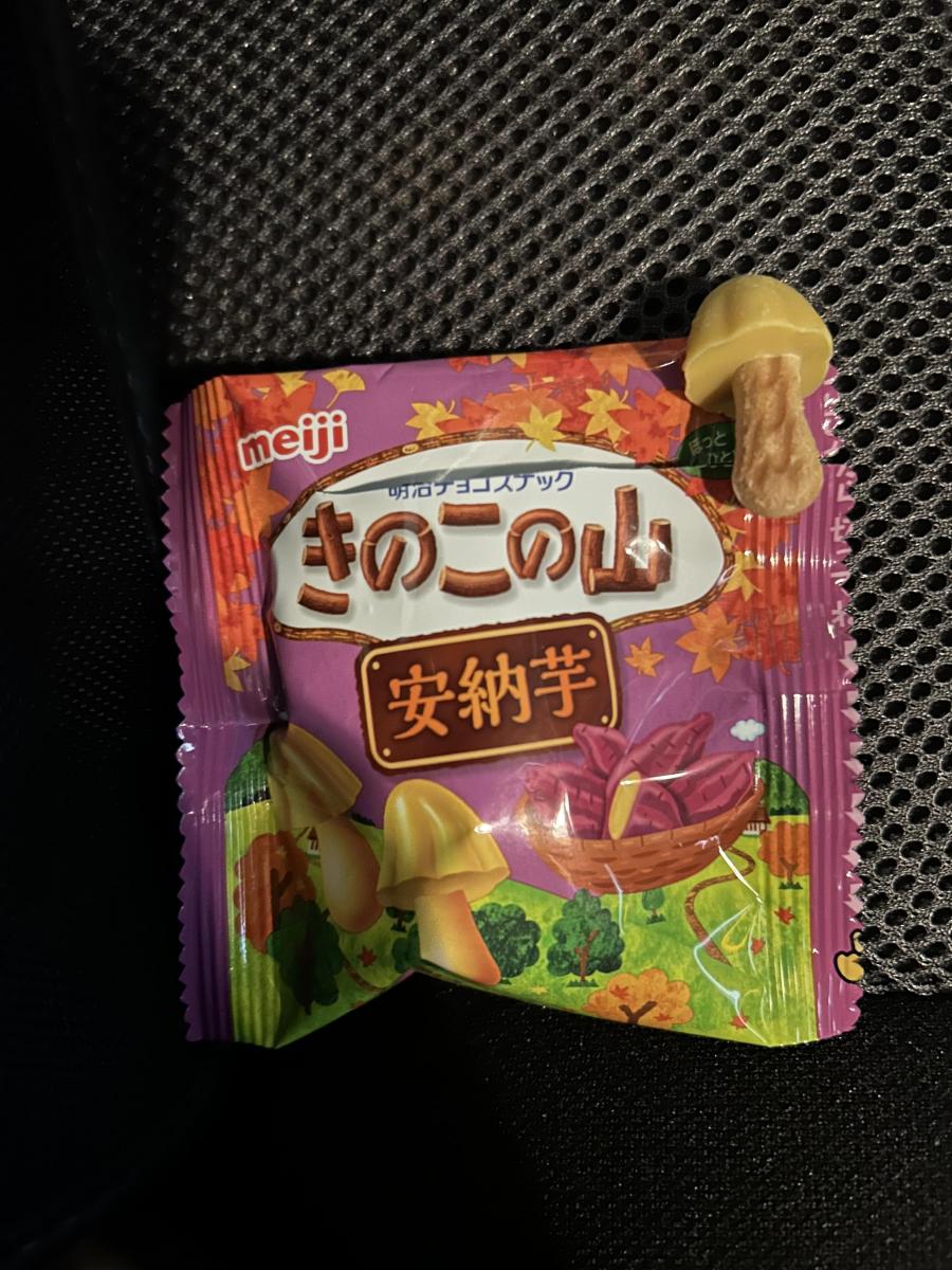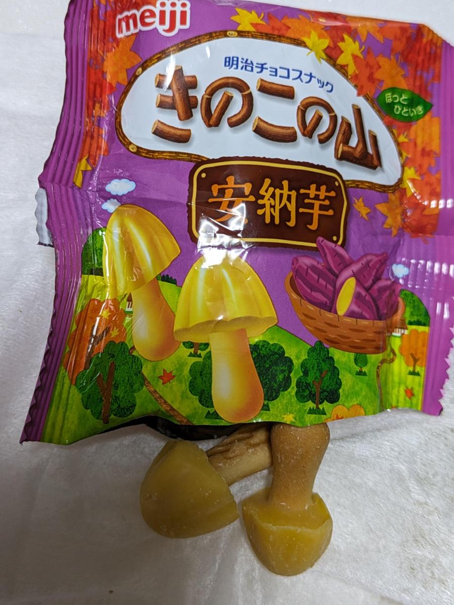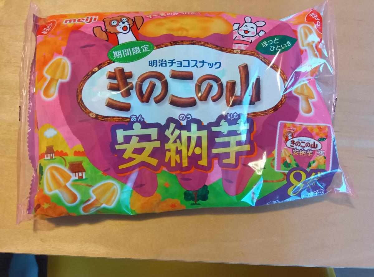 秋らしい紫と黄色の色が華やかなパッケージのきのこの山です。安納芋の味を堪能できるという、楽しいきのこの山です。