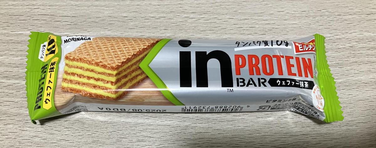 プロテインバーには珍しい抹茶味のタイプです。サクサクした食感のウエハースの間に抹茶クリームが挟まっていて、抹茶の微かな甘みと苦味があり美味しいです。