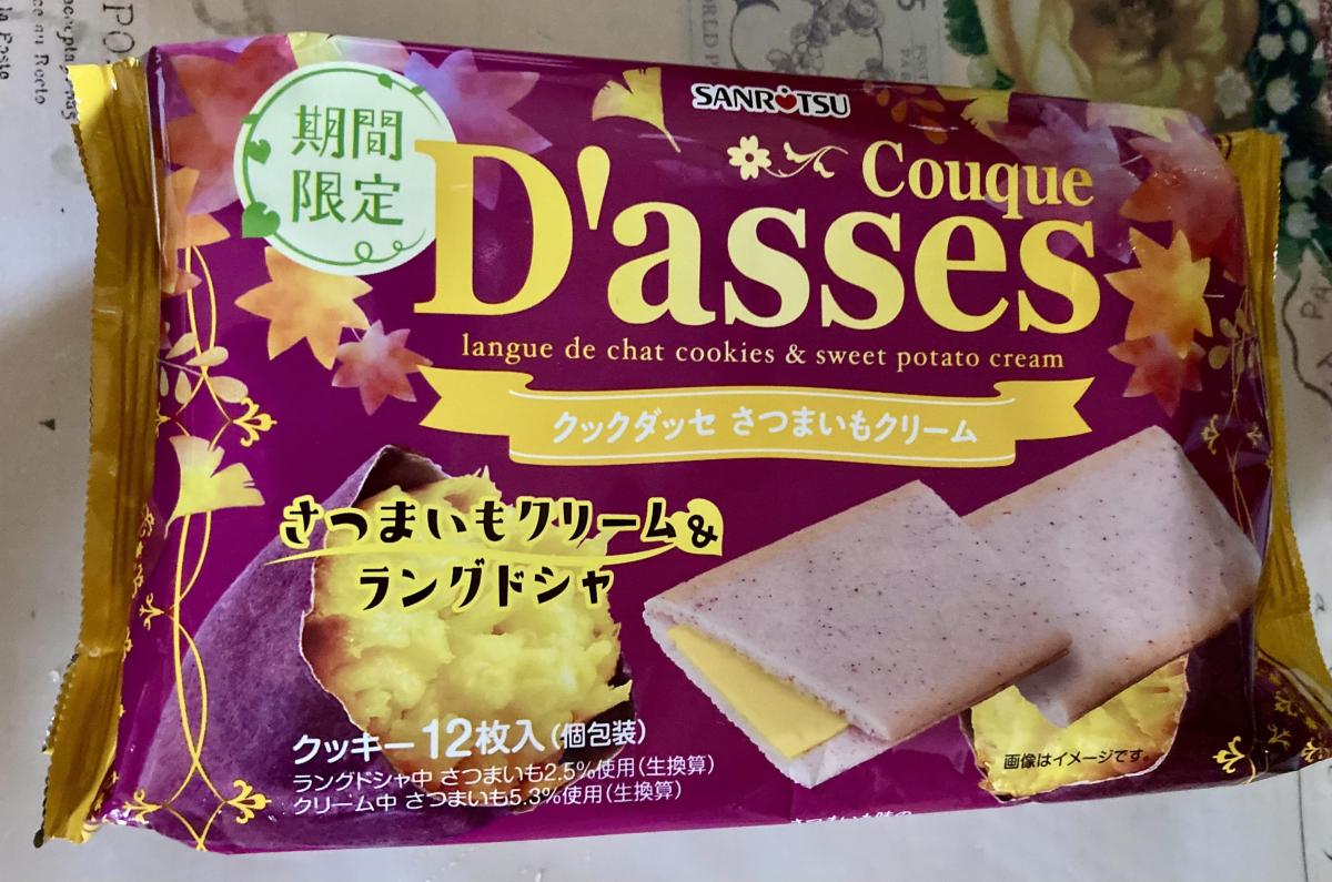 クックダッセにさつまいもクリーム味が出ていたので気になり購入してみました。袋開けると12枚も入っており、小分けされているのでシェアできて大変便利です。サクサクしたラングドシャで、紫芋の可愛いクッキー生地に鮮やかな黄色のクリームですが、さつまいもクリームはそこまで強めではなく、食べやすい味わいでした。もう少し強めの方が好みかも。
