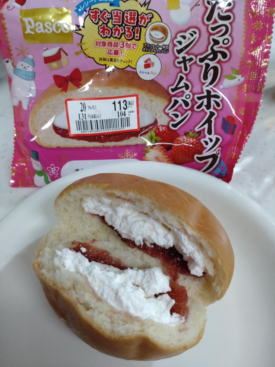 パンが柔らかくて美味しいパスコのパンを見つけたら買ってしまいます。ジャムとホイップ入りを買いました。2つに割ってみると、真っ白なホイップがたっぷり、下側に赤い苺ジャムがありました。ホイップが3/4、ジャムが1/4くらいの比率でした。