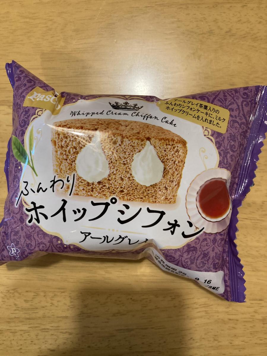 Pascoのふわふわシフォンケーキのアールグレイ味、初めて食べました!これめちゃくちゃ美味しかったです。菓子パンの甘さがあまりなくて自然な甘さでそしてふわふわ生地。パンの中にホイップが入っていてシフォン生地のアールグレイが強くてハマりました!美味しい〜これは菓子パンというより洋菓子です。(笑)