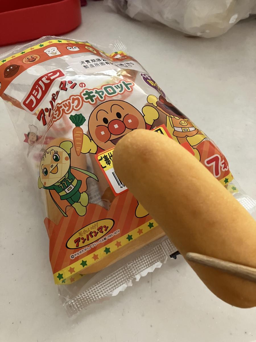 アンパンマン好きな娘のために購入。『フジパン アンパンマンのミニスナック キャロット』です。あまり人参が好きではない娘なので、同シリーズのなかでも栄養が摂れそうなものをチョイス。