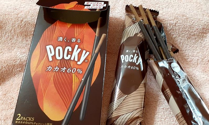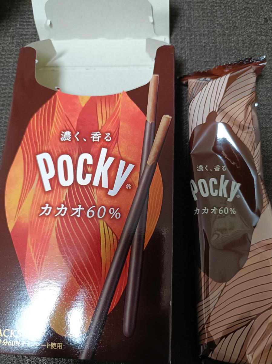 久しぶりにポッキーを買いましたがおいしかった。ほろ苦な味がおいしいカカオ60%のポッキー。甘さはあるけどビターな味わいでスッキリしているのでどんどん手が進む美味しさです。2袋入りで量も少なすぎずちょうどいい。一袋食べると満足感ありました。パッケージのカカオのデザインも素敵だと思います。また購入したいと思います。