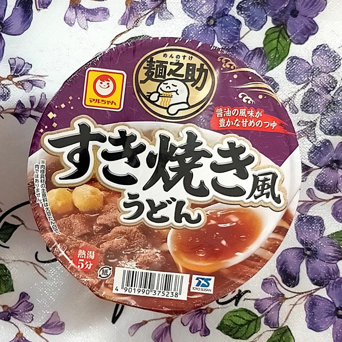 紫のパッケージに惹かれてと、お手頃価格で購入しました。スープが甘めで、すき焼きっぽい味わいでした。丸いたまご?が少し大きめ?で美味しかったです。お湯を入れて、3分と勘違いして蓋を開けてしまいましたが、5分でした。半分くらい食べてから生卵を入れていただきました。こちらも美味しかったです。ご馳走様でした。