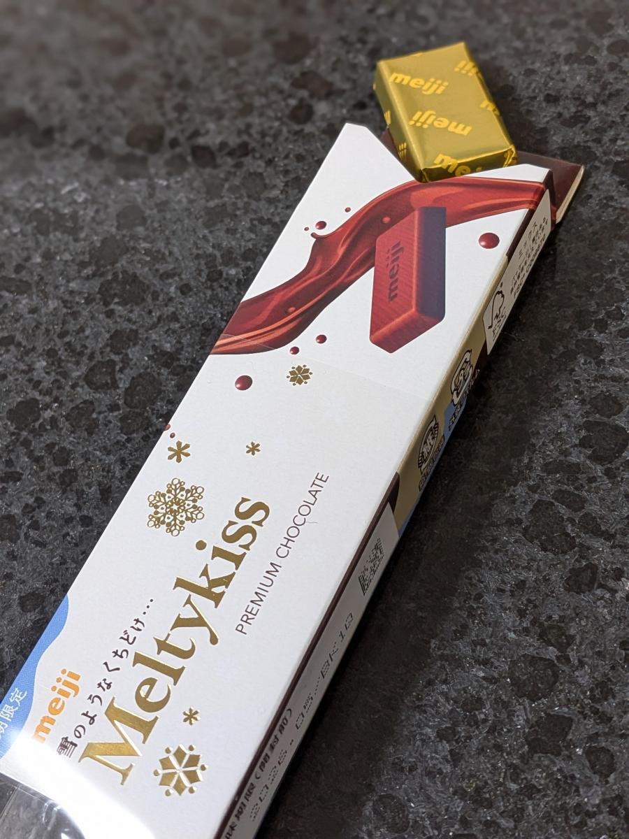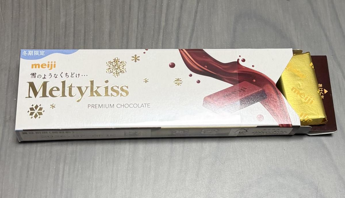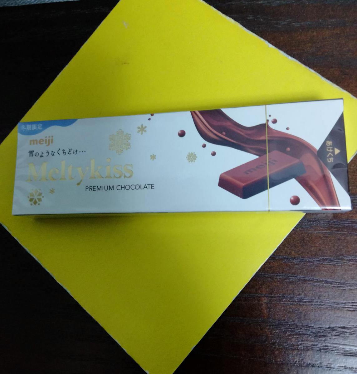明治メルティキッスといえば、キューブのボックスに入った、周りにパウダーのついた商品が代表的だと思いますが、こちらはよくある一口大の板チョコような見た目です。