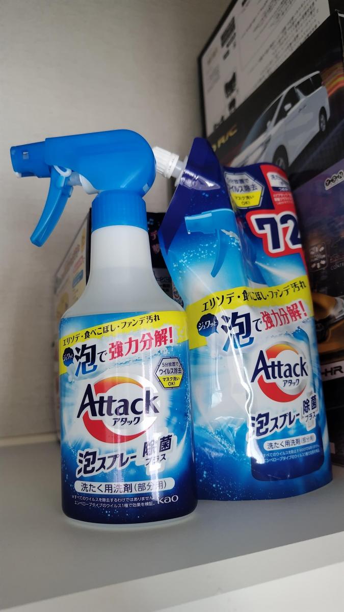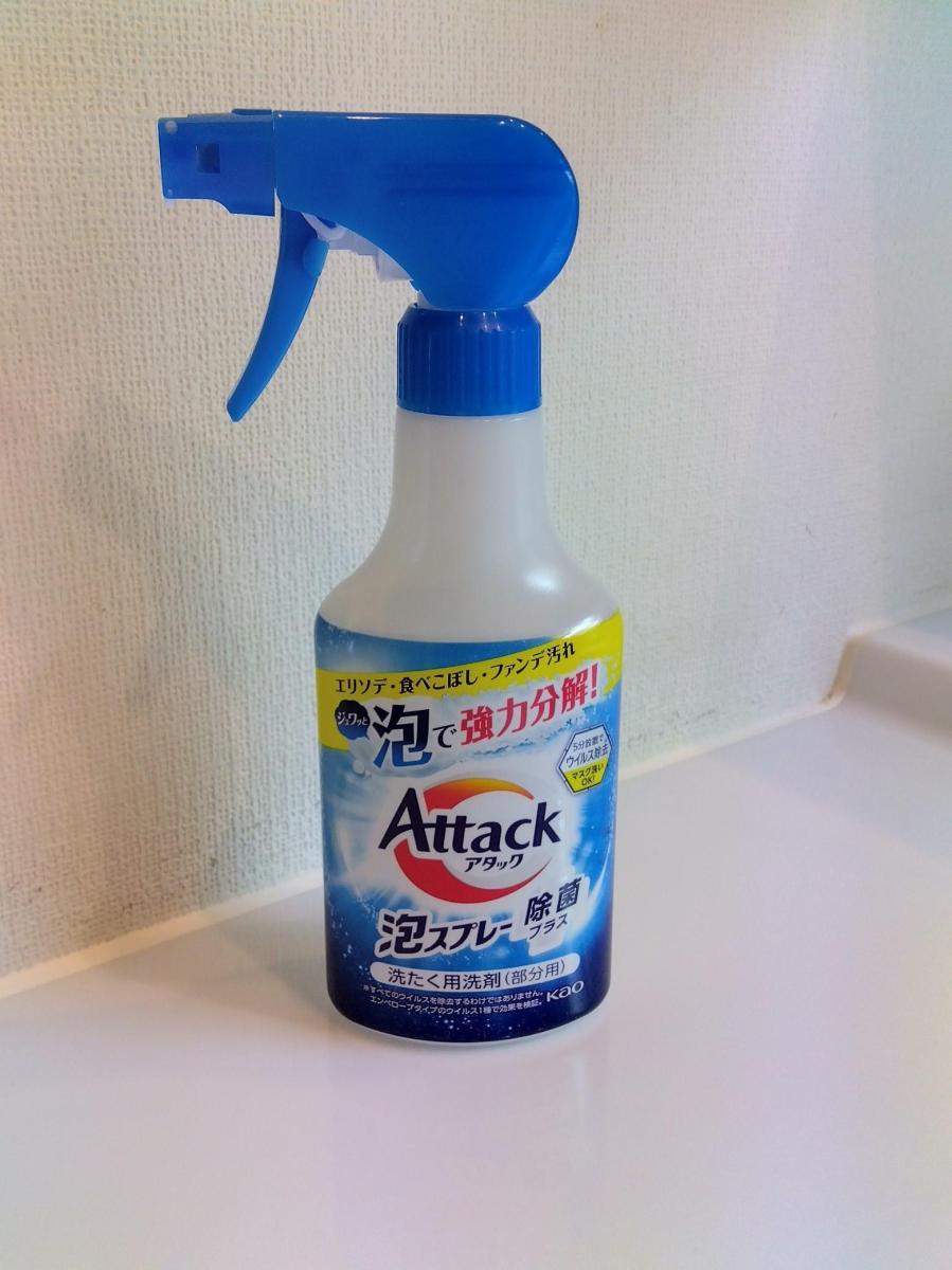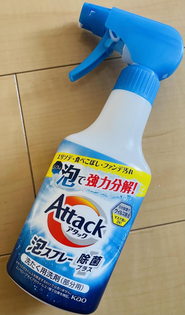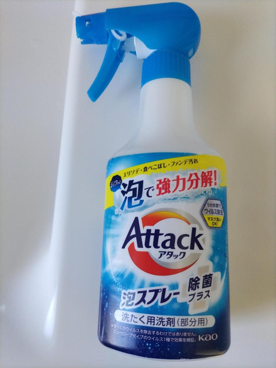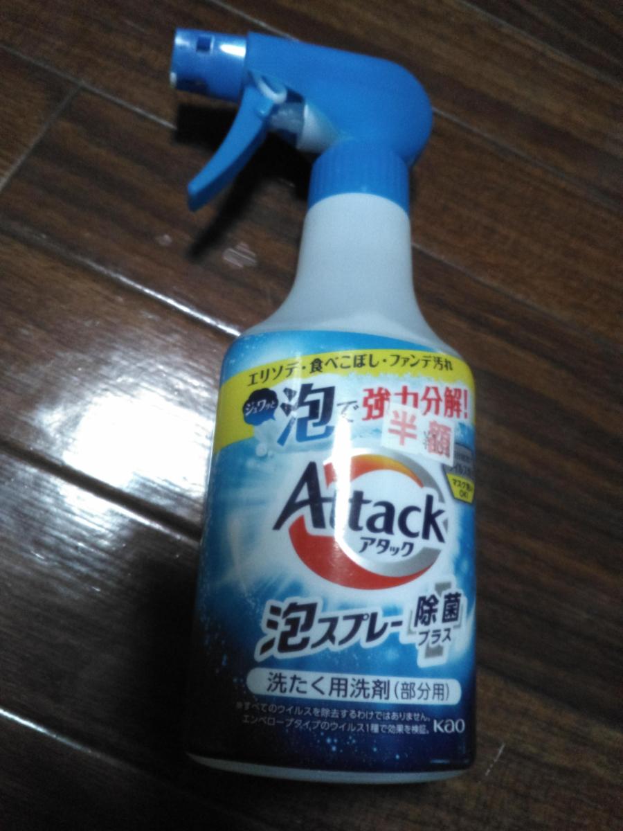 花王アタック泡スプレー除菌プラスはドラッグストアで購入しました。こちらは普通の洗濯の前にシャツの襟や黄ばみ、汚れが付いた時にスポットで泡をかけます。普通洗濯では取れない汚れが取れて使いやすいです。