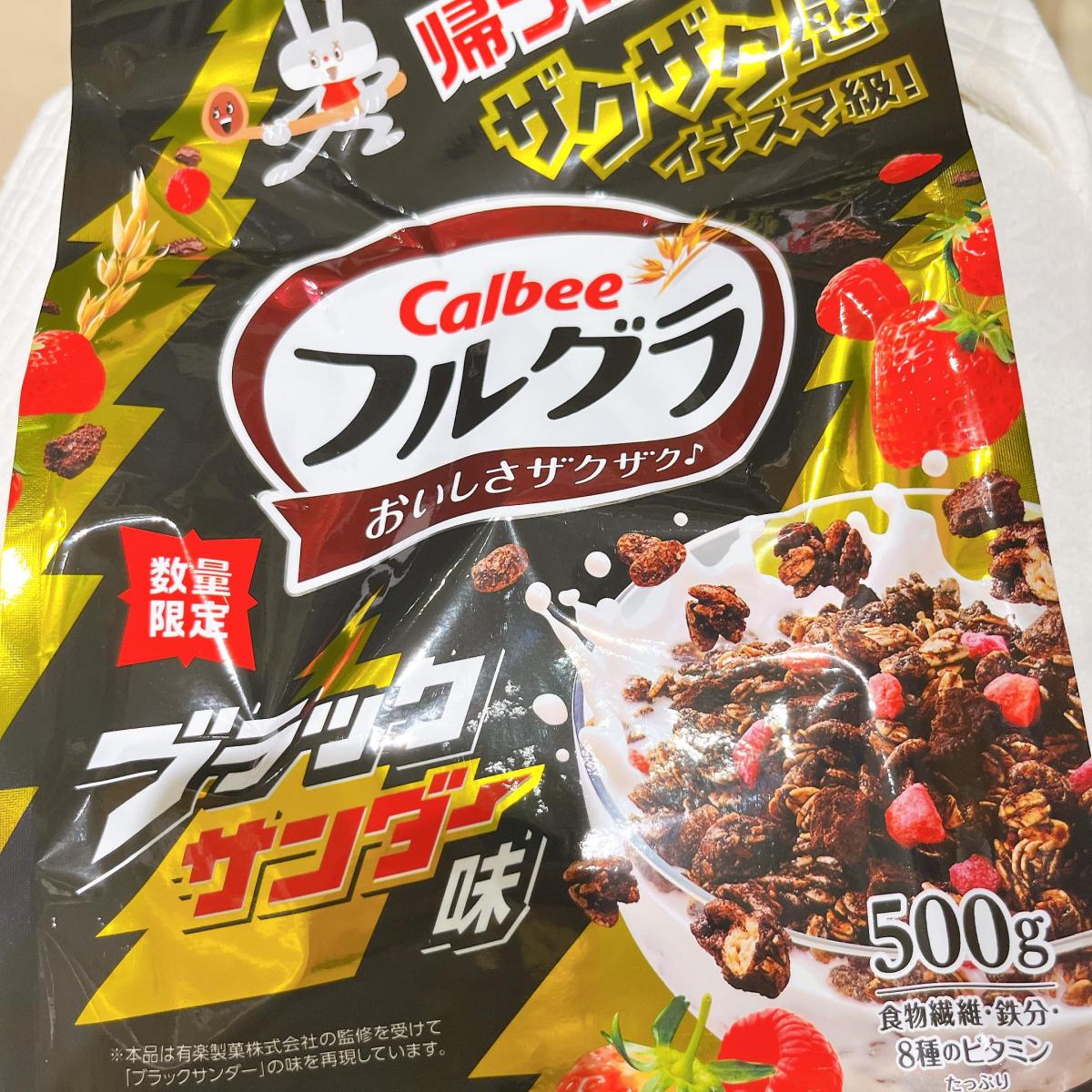 SNSで見て気になっていましたがようやくお店で見かけ数量限定というところもあって迷わず購入しました。通常のフルグラ同様、ザクザクしたシリアルはブラックサンダーだけに黒い!お菓子を想像していたので食べるとチョコの甘さは控えめでココアのほろ苦さの方が後味に残りました。クッキーも入っていたりとお菓子感覚でもあり、ビタミンや食物繊維も摂れるので朝食だけでなくおやつにもしています。バニラアイスにトッピングして食べてもおいしかったです。