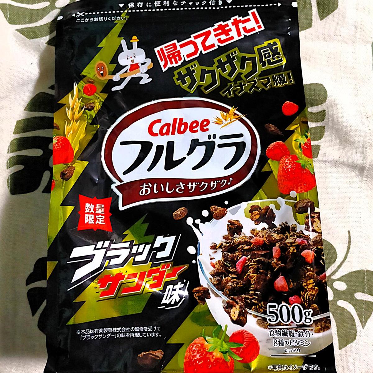 いつものフルグラに、ブラッキーサンダー味が!これは買わなきゃ(食べなきゃ!)開けて、お皿に入れて見ると…黒い!ホントにブラックサンダーだ!ザクザク感がイナズマ級で、そのまま食べた方がウマかったです。