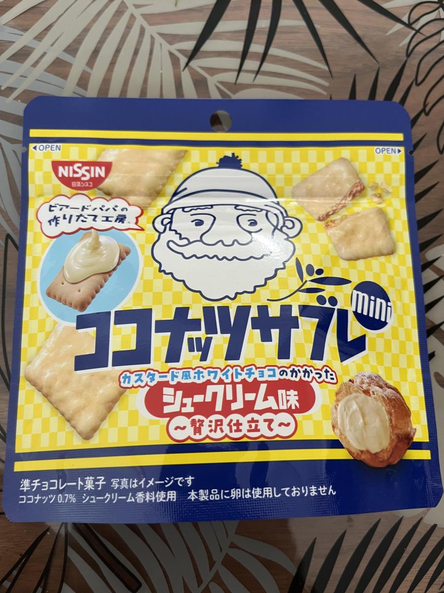 ココナッツサブレミニ シュークリーム味 ~贅沢仕立てのネーミングとパッケージに目が惹きどんな味か試したく購入してみました。ジップ式なので持ち運べて便利です。いつもより小さめなサイズ感で、生地はサクサク軽くて口溶け良く優しいカスタード風味のココナッツサブレです。シュークリームの味わいはあまり感じないですが美味しいです。