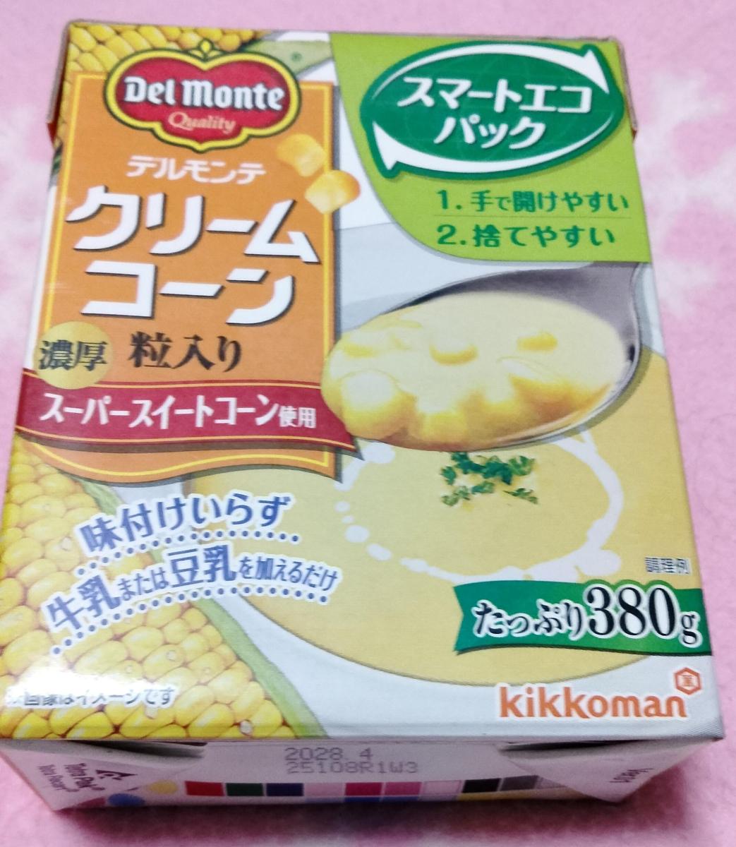 デルモンテさんは🍅系はカゴメ好きな私はちょっと違う味わいで知ってはいるもののあまり馴染みがなかったけれど👦が🍅を買ってカレーを作っていた時に残りを貰って缶より扱い易いパックで味も悪くないから見直してコーン🌽も買ってみようと思ってた🌽は粒が好きでスープは粉末よりレトルトの方が美味しいと思うもののレトルト買う時には🎃を選んでしまってクリームタイプ縁が無かったみたい…でもSaleに出逢って🌽缶のストックがあったので少し粒入りなら牛乳又は豆乳を加えるだけ…に惹かれて