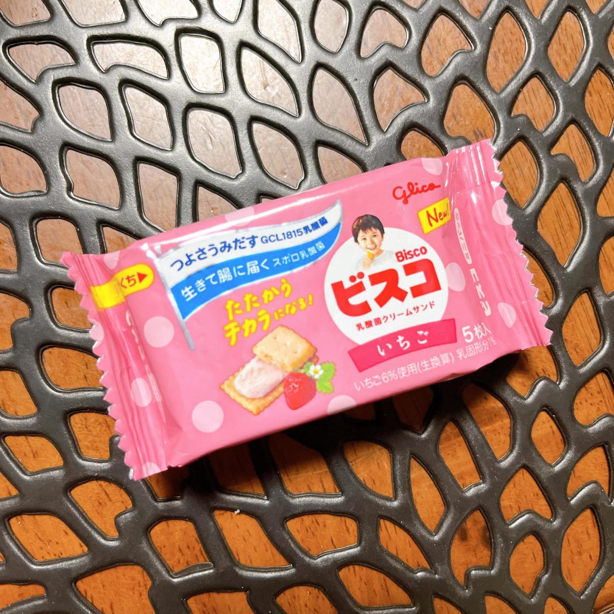 ナッツかビスケット、今はこのいちごのビスコが入っています。ビスコは子供の甘いおやつといったイメージがありますが、乳酸菌や食物繊維も配合された腸にやさしいビスケットです。いちごの甘酸っぱいクリームとサクサクの食感が美味しいですね。