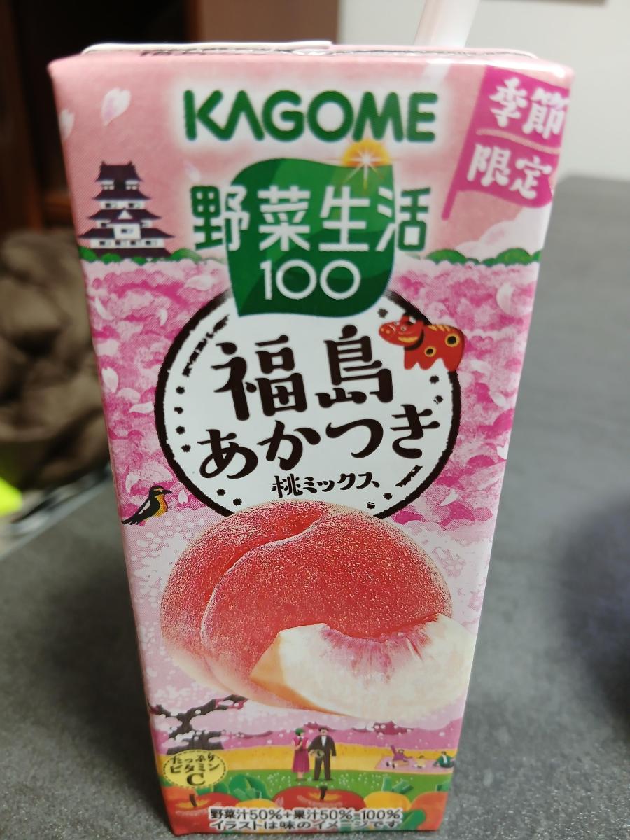 季節限定で野菜生活100で福島あかつきの桃ミックスが出ていたので買ってみました。野菜汁50%と果汁50%で程よいブレンドで飲みやすくおいしいです。