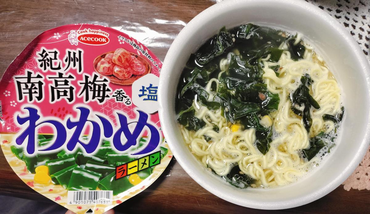 わかめラーメンも梅味も好きなので買ってみました。麺はつるつるとすすりやすく、食感はもちもちとしています。梅の香りは梅ガムや梅ミンツのような作られた感じに思えますが、食べ始めると違和感はなかったです。夏向けの商品だったようで、ほんのりしょっぱくて、ほんのり酸っぱいスープがさわかやでした。わかめはシャキシャキ食感で歯ごたえがあります。たくさんわかめが入っているので、食べ応えがあっておいしかったです。コーンの部分が甘くて、良い味わいを出してくれていました。次の夏にも食べられると嬉しいです。