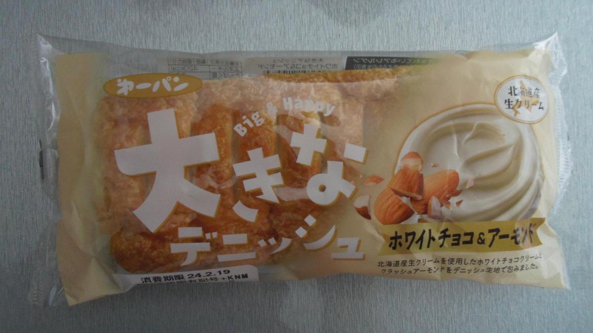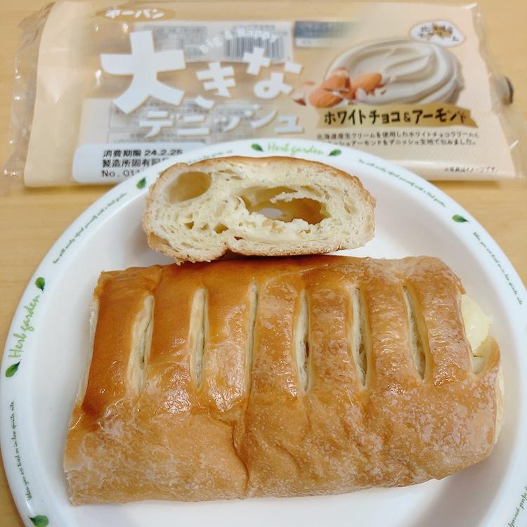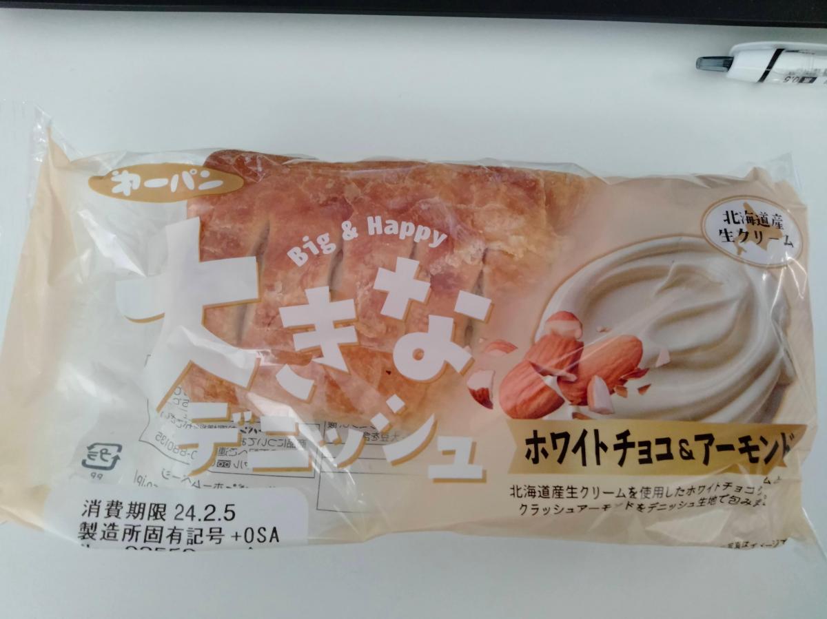 大きなデニッシュのホワイトチョコアーモンド味が大変気になり購入してみました。リベイクしてみました。するとデニッシュ生地は表面サクサク、中はふんわりしっとり、ほんのりマーガリンが香り、やや塩味のある香ばしい味わいになり大変美味しいです。ホワイトチョコクリームはねっとり、まったり甘くミルキーで、クラッシュアーモンドがクリームに混ぜ込まれていて、食感と香ばしさがいいアクセントで美味しかったです。