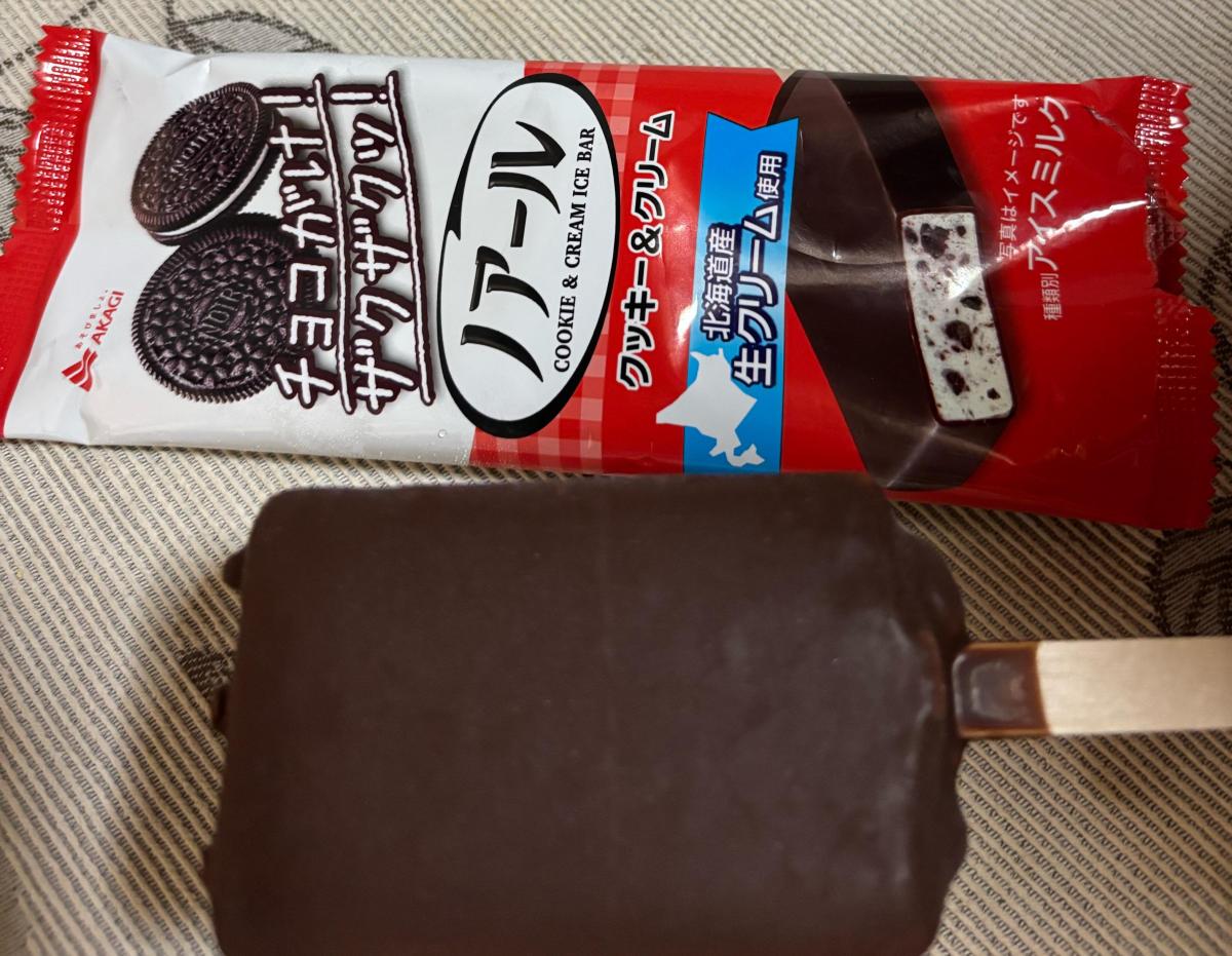 食べると、白いアイスの中に、ノアールのクッキーが、大きめの粒で、ザクザク入っていて、食べごたえ満点です。