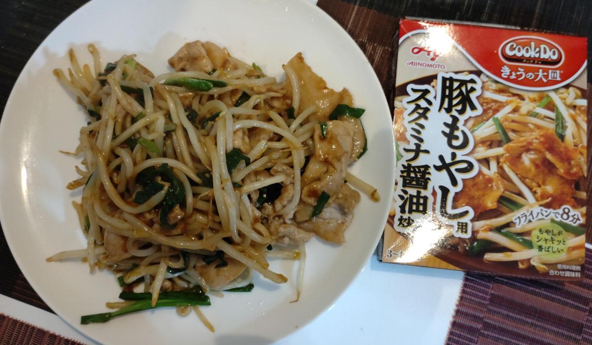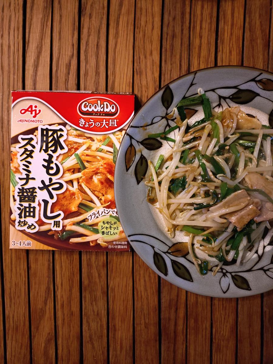 今回も手順通りに。クックドゥで作るおかず美味しい!もやしもニラもシャキシャキ。程よいとろみがお肉と野菜にからんで自己流の豚もやし炒めとは違う美味しさ。味に深みというかコクがあるお店で食べる豚もやし炒めが出来上がりました。