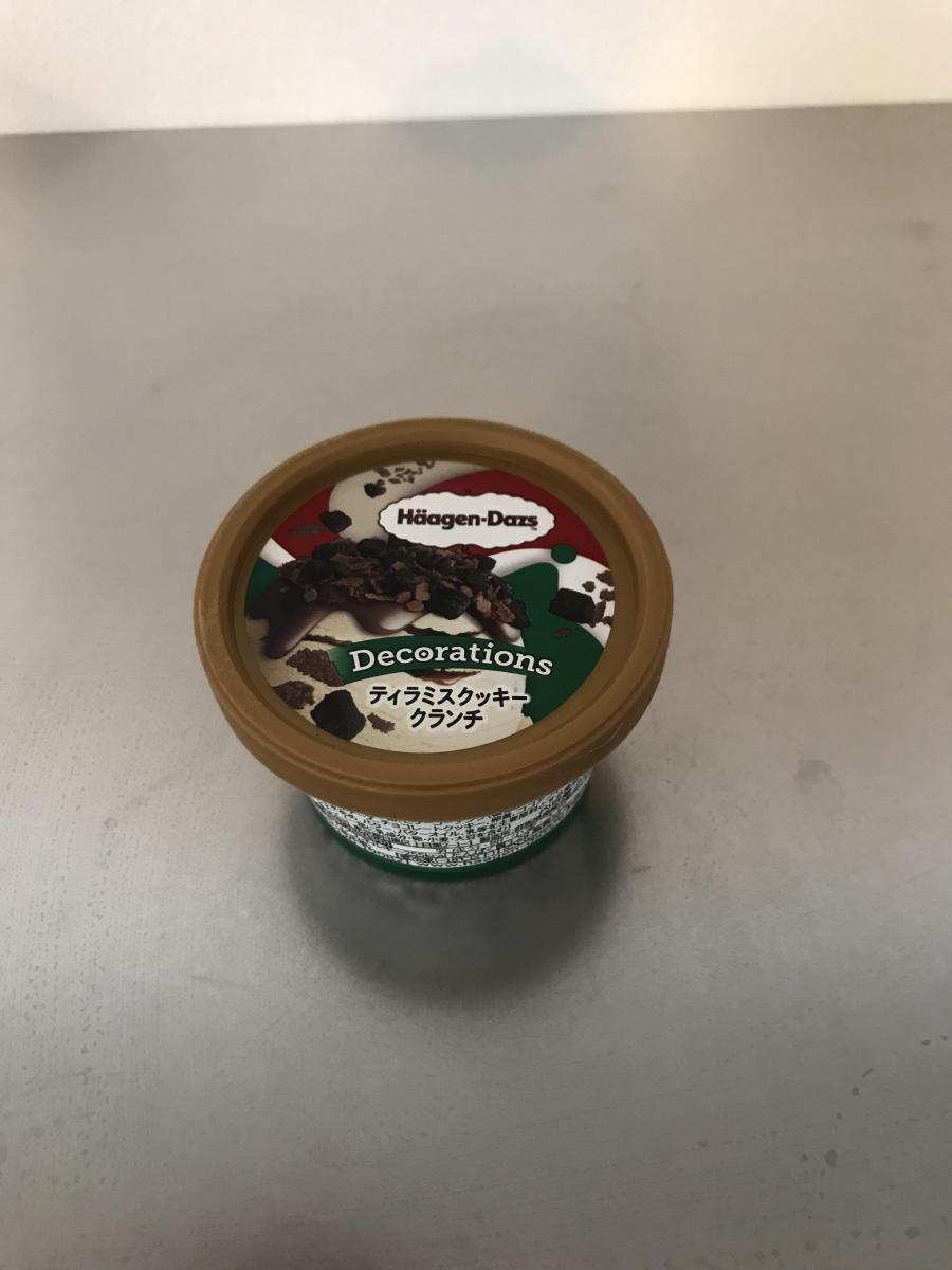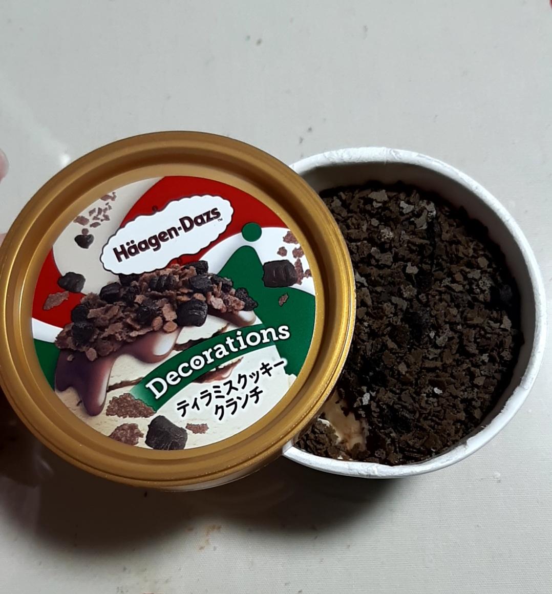 蓋を開けたら、クッキークランチがぎっしり詰まってます。ティラミスの濃厚な味がアイスクリームで表現されていて、とてもビターで美味しいです。デコレーションシリーズにぴったりなアイスだと思います。