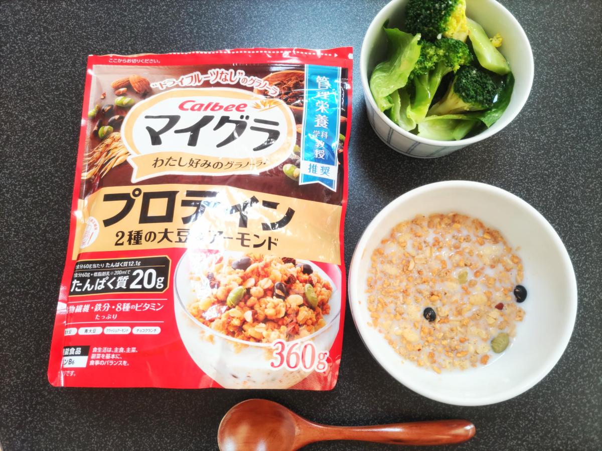 プロテインの味は特別しないけれど、麦の香ばしさがあり、食感がサクサクだな〜と思うのと、豆の味がしたら一気に豆一色になり、ひたすら豆を食べている感覚になります。バナナを入れたら少し味が分散されて、バナナの唯一の甘味が美味しく感じられます。朝の朝食に気軽に選ぶものではなく、栄養食寄りでした。