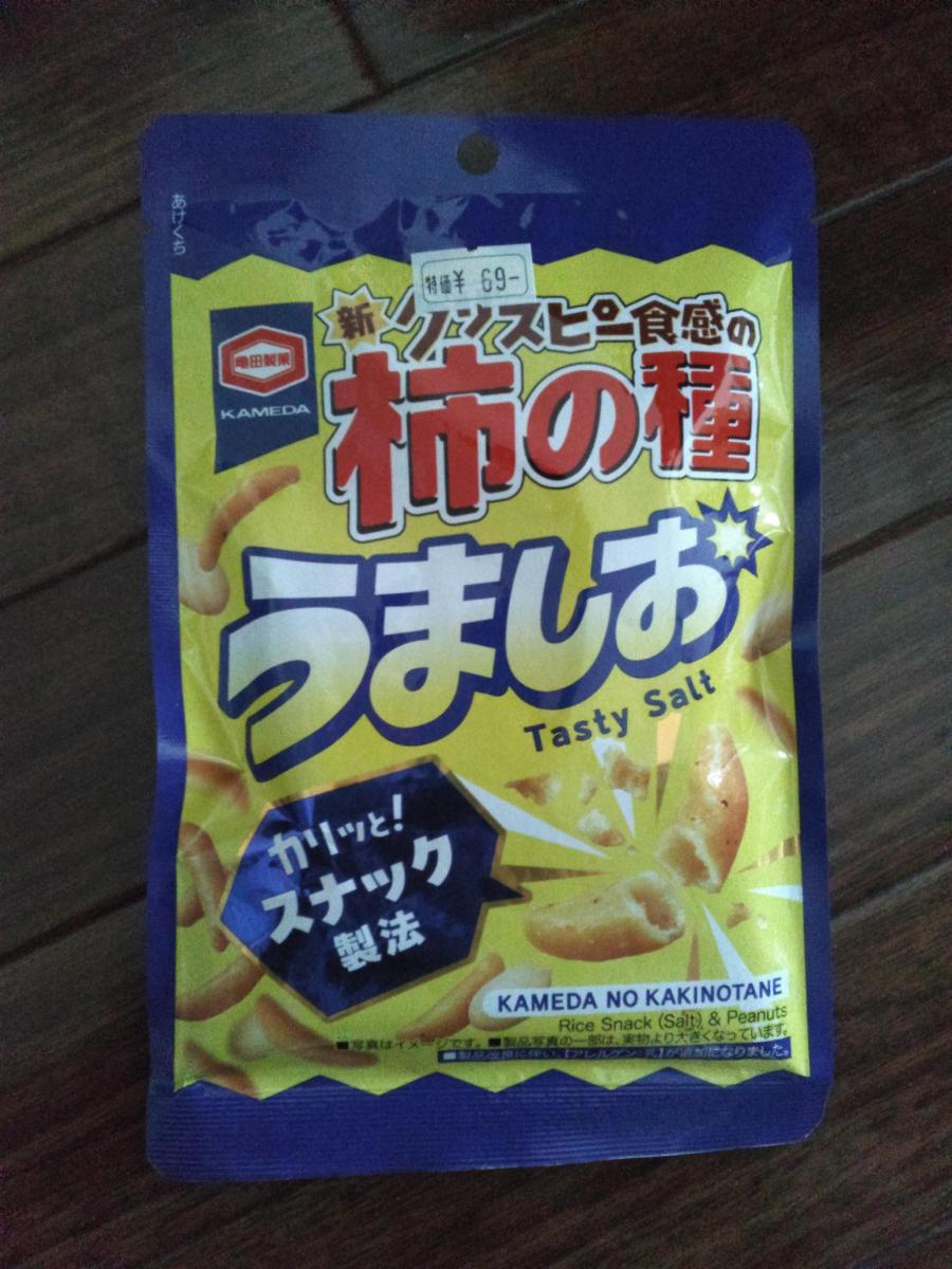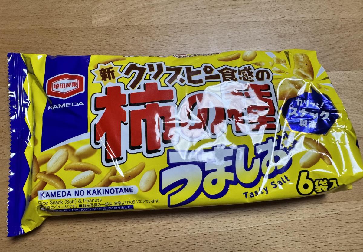 黄色い派手目なパッケージの柿の種。新クリスピー感覚で、うましおという商品に目が留まりました。