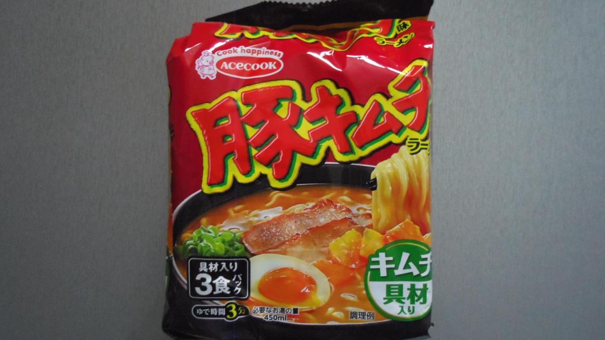豚キムチ味のとおりのピリ辛濃厚スープの袋麺。スープは豚骨ベースにキムチのピリ辛味がプラスされていて、辛さは辛いものが苦手な人には少し厳しいかもしれないけれども、特別刺激が強いというほどでもない、という程度。豚キムチの辛みと肉のコクが感じられるスープになっていて、豚キムチそのものでなくとも、野菜をたっぷりと入れるといかにもおいしそう。具材入りというのも注目だが、これはキムチの白菜が少し入っている程度で少しさみしい。が、具材そのものの味はキムチらしい味がしみこんだもので悪くない。麺の印象はやはりエースコックというか、ワンタンメンの麺と同じようなモチモチ食感のものなのだが、個人的にはこの麺はどうもスープとマッチしているようには思えず、もっとシンプルな食感の方がいいような気はする。とにかくスープの旨みをより引き出すように色んな具材を入れて食べるのがオススメかと思った。