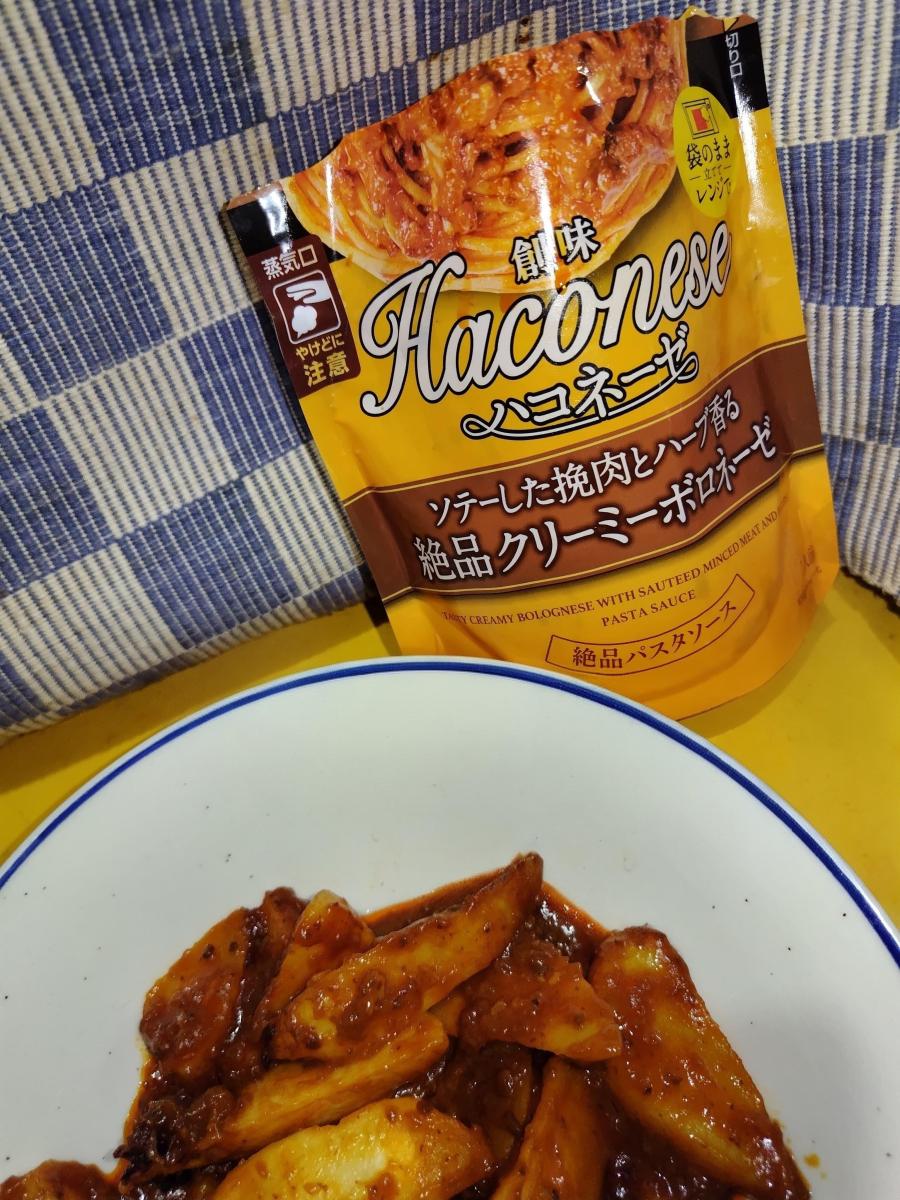 箱がないパスタソースハコネーゼのクリーミーボロネーゼ。ごはんやうどん入れるレシピをCMで見てなるほどと思ってホームページを見たらごはんやうどんだけじゃないいろんなレシピがのっていて興味深かったです。今回その中から冷凍フライドポテトを入れてチンしてみました。本当は違うソースのレシピでしたがやってみたくて。袋を開けただけで肉の旨味を想像させるおいしそうな香りがしてます。皮つきの大きめカットだったからか混ぜかたがたりなかったからか底の方が少し焦げたようになりましたがそれはそれで美味しいです。肉の旨味が濃くてクリーミーでポテトに合います。肉が少なめかも知れないけどポテトにはちょうどよかったです。粉チーズたっぷりかけました。