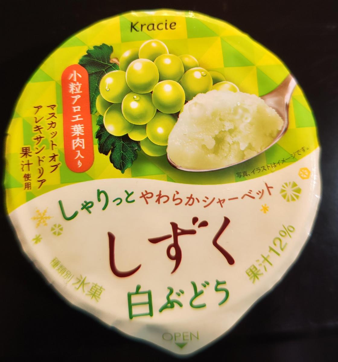 アレキサンドリア果汁を使ったシャーベットアイスです。香りがとても高く白ぶどうの爽やかで優しい香りがフタを開けると広がります。シャキシャキというよりなめらかな口当たりのシャーベットです。