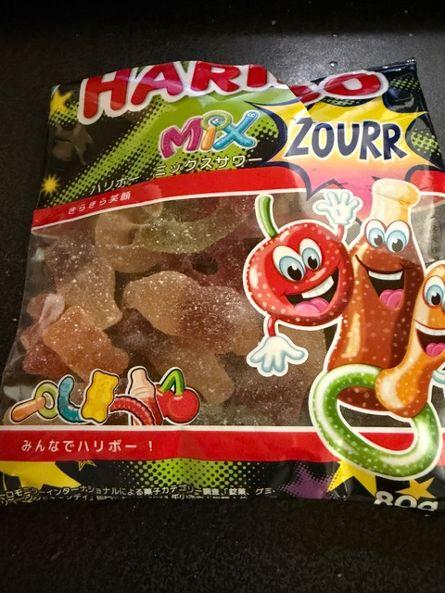 色とりどりなミックスで、ゴールドベア、ハッピーコーラ、ハッピーチェリーなどが入っています。ハリボーファンの子ども。ねじったり、指で引っ張ったり、つまんだりの面白い弾力です。袋から出すとあっという間になくなります。ハリボーにサワーの酸っぱさが加わり、型がそれぞれに工夫されています。