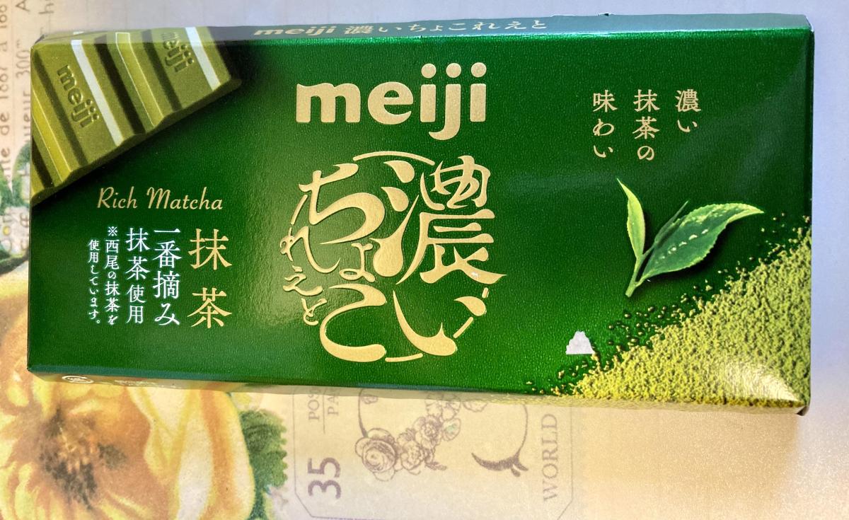 抹茶をイメージさせる濃い緑色と「濃いちょこれえと」の金色の文字に惹かれて購入。抹茶味がすご〜く濃そう!パッケージ見ているだけで期待が高まります。