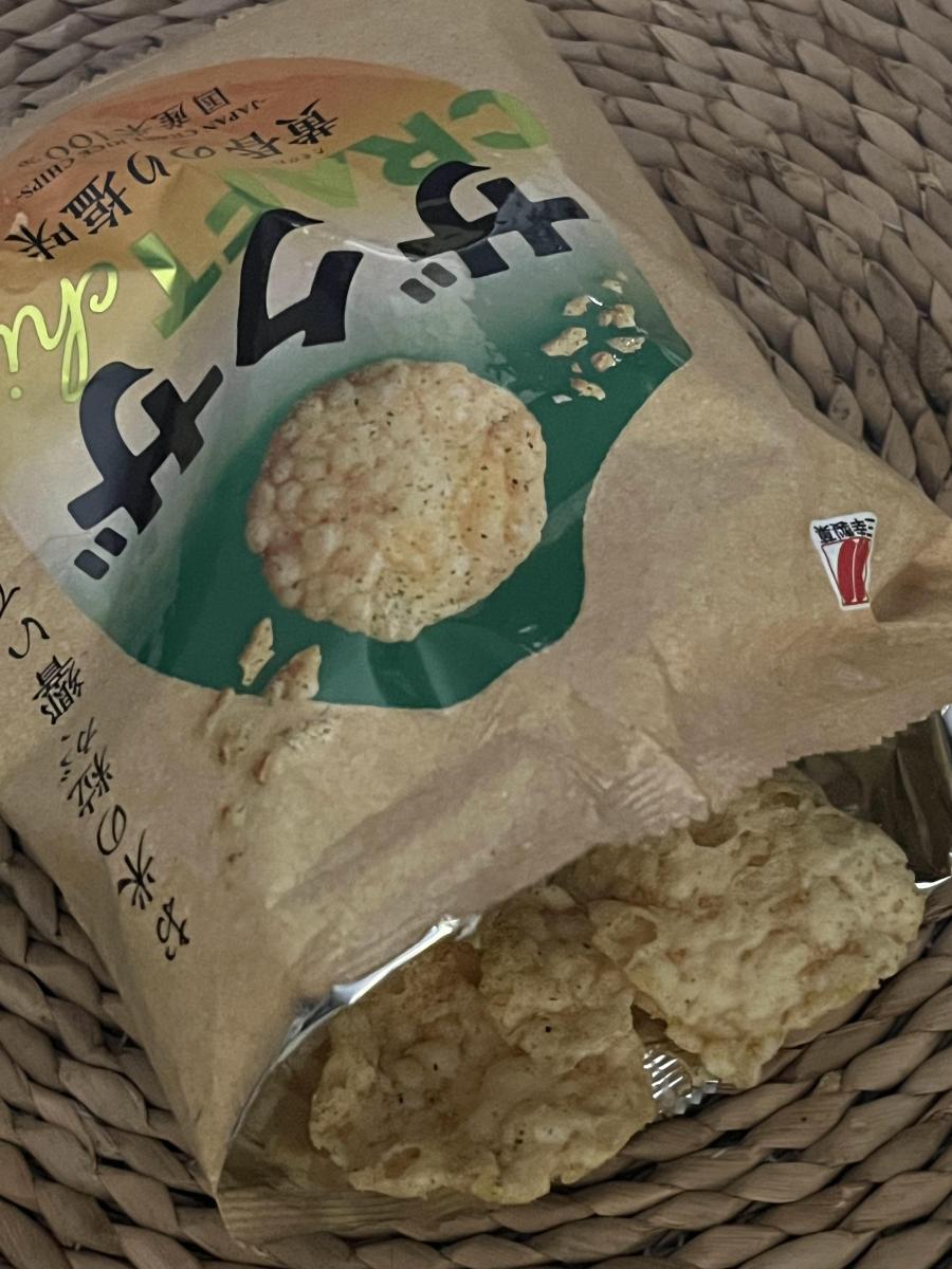 1枚食べてみると、食感が予想していたものと違って、おもしろいなと思いました。ちょっぴり塩辛で、お茶とよく合うなと思いました。国産米100%というのも安心して食べることができてよいですね。