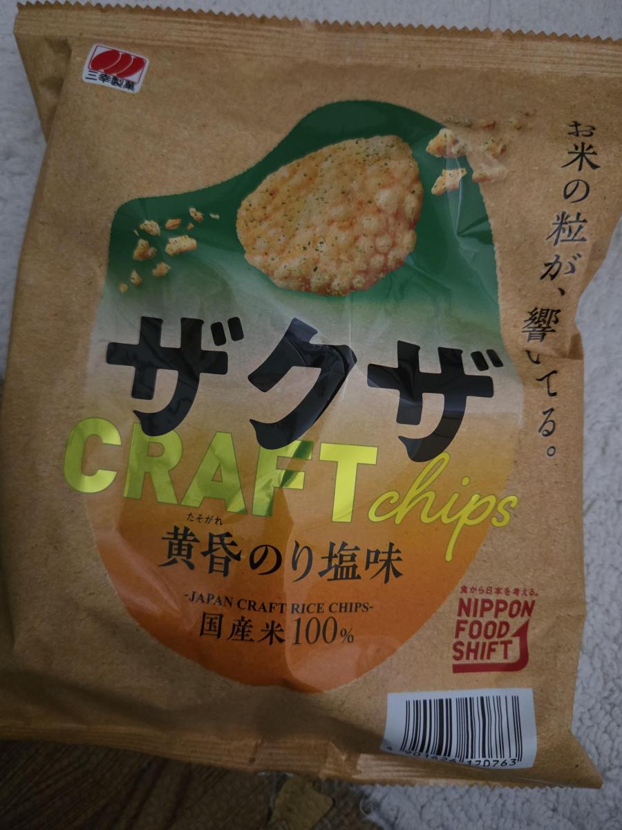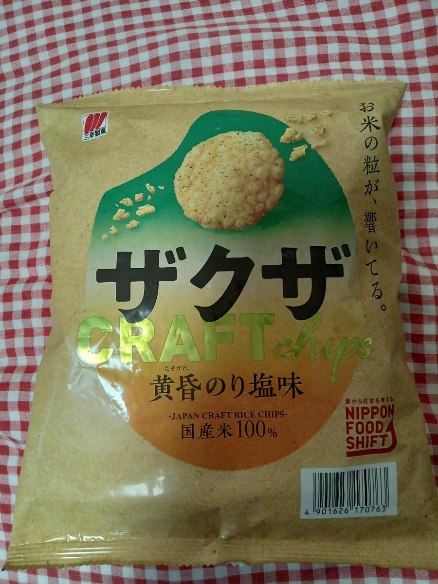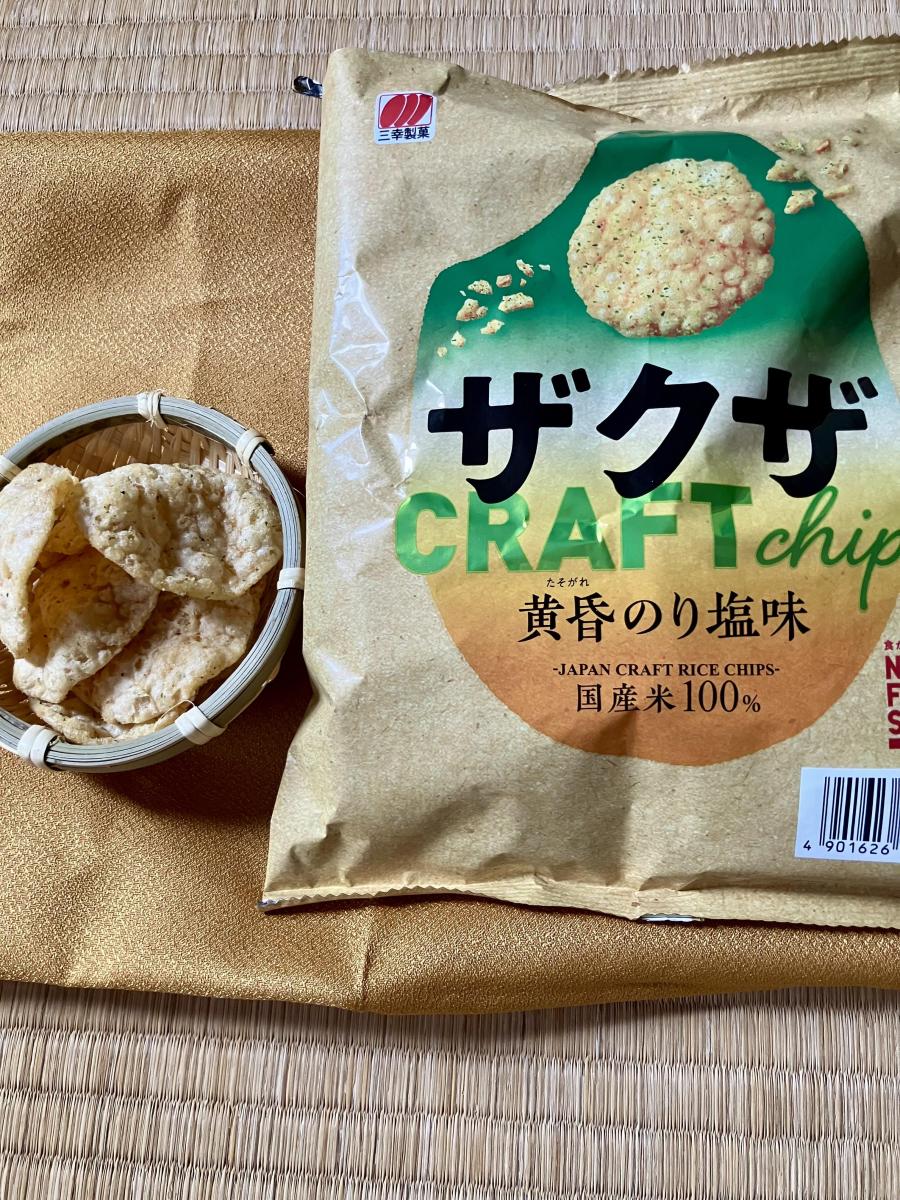 ザクザの黄昏のり塩味を買ってみました。サクッと軽い食感のお米スナックです。中に歯ごたえのあるお米の粒が混じっていて、そこを噛みしめると香ばしくておいしいです。
