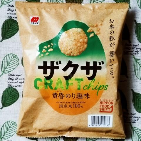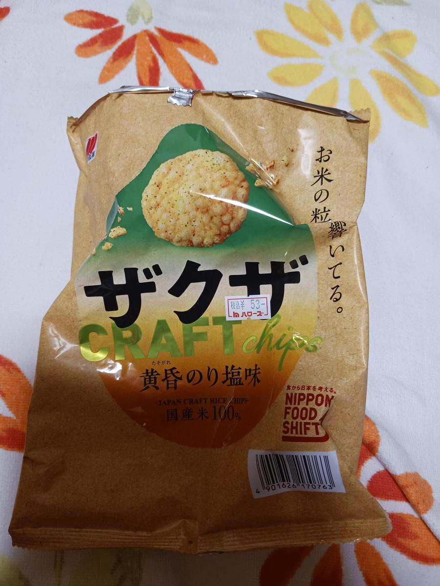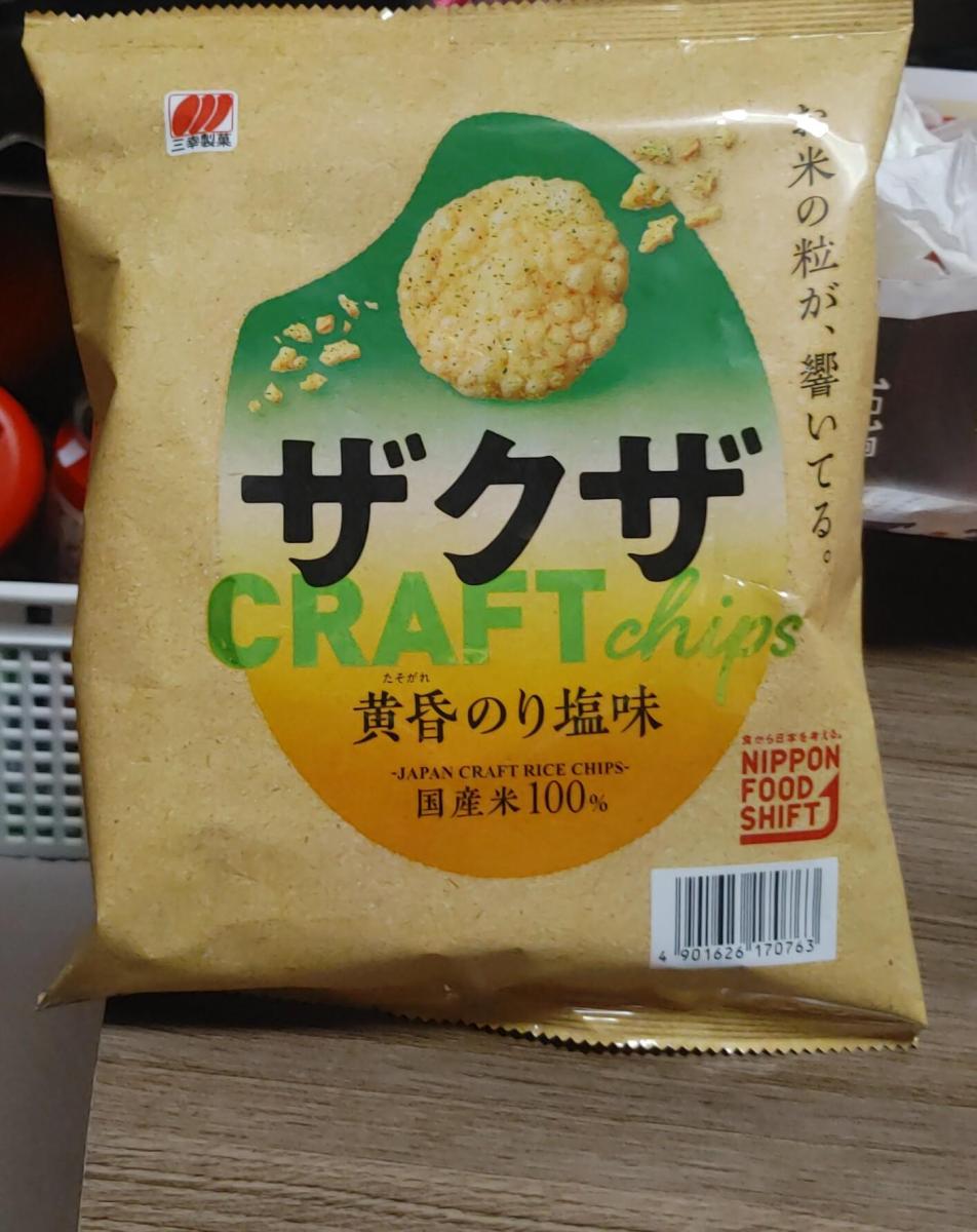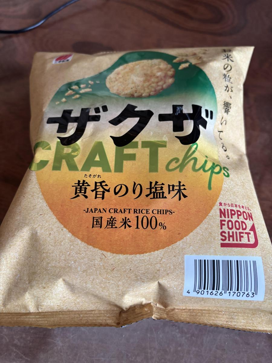 ザクザの黄昏のり塩味を買ってみました。サクッと軽い食感のお米スナックです。中に歯ごたえのあるお米の粒が混じっていて、そこを噛みしめると香ばしくておいしいです。
