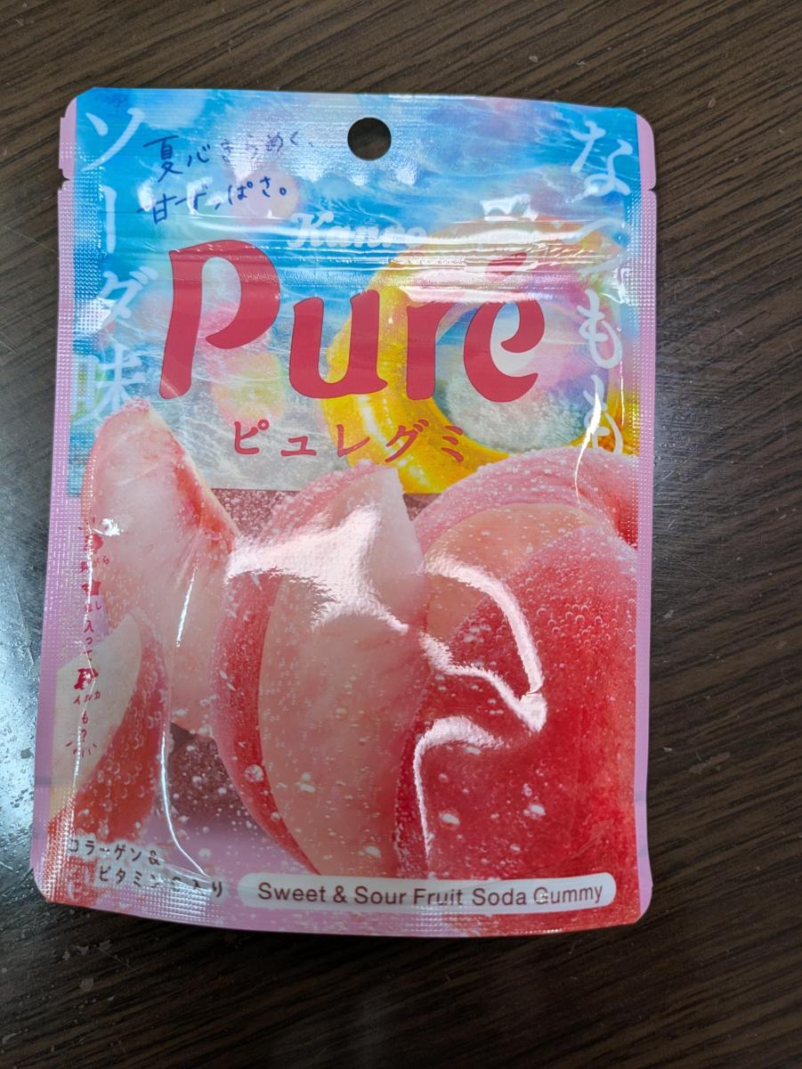 なつらしいパッケージが目が惹きソフト系のグミの方が好きなので購入してみました。ソフトですが、少し弾力感もあり、パウダーのシャリシャリ感がいいアクセントになっています。噛むほどに桃の優しい風味と甘さが心地がよく、外側のパウダーが結構酸味があるので酸っぱい好きにはぴったりな味わいでした。ソーダー感はあまり分からなかったですが、美味しかったです。