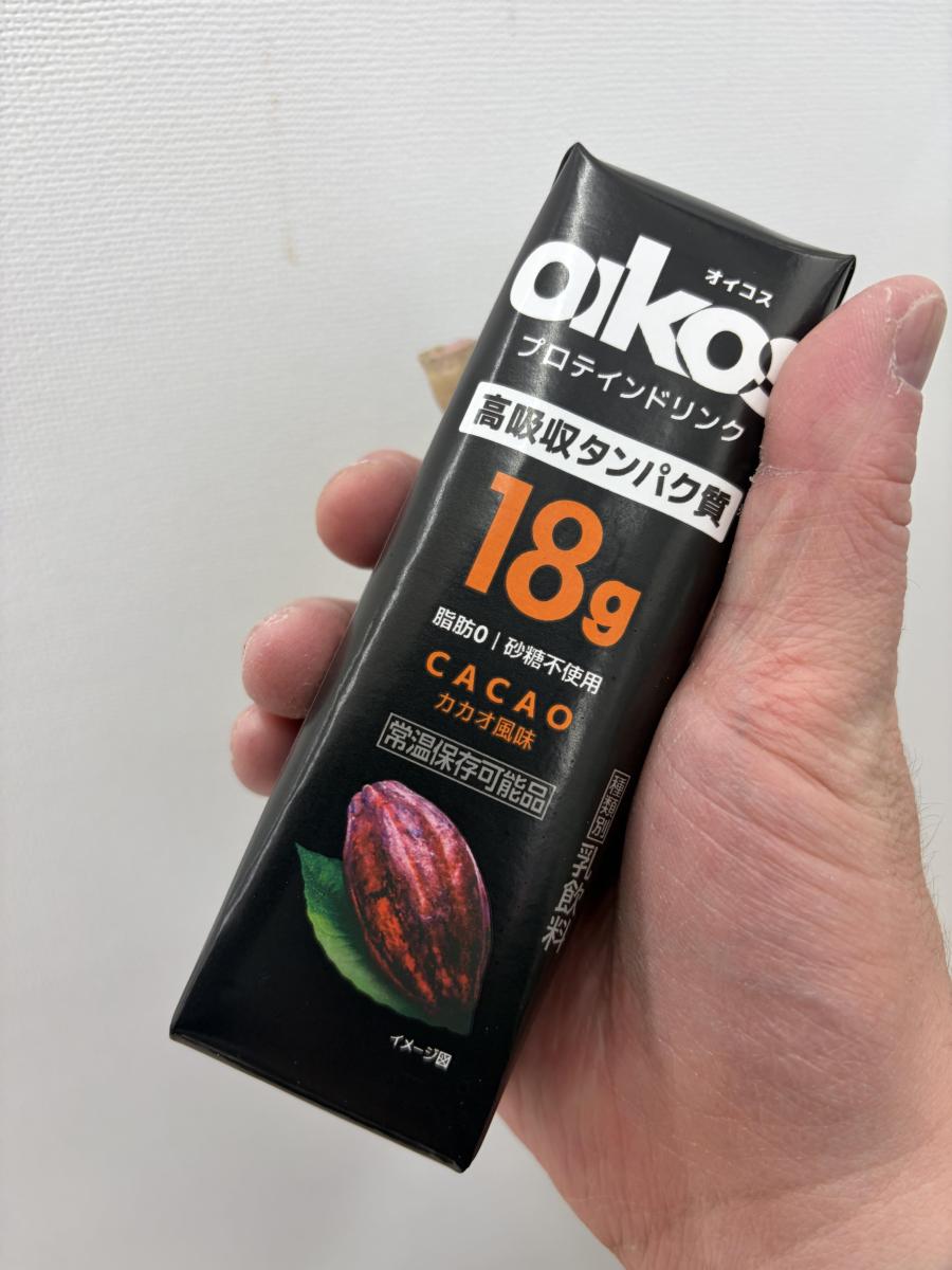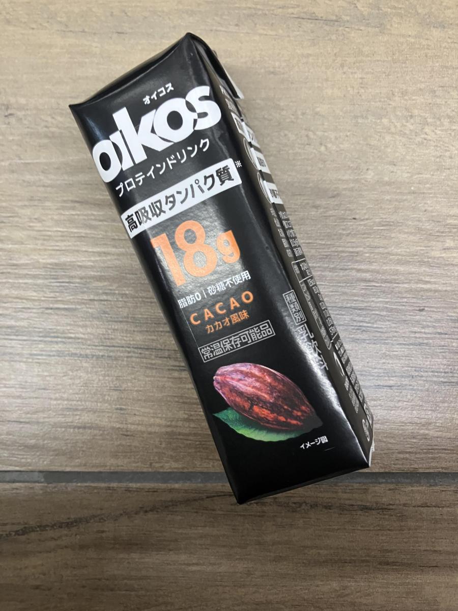 オイコスはヨーグルトのブランドだと認識していたので、ヨーグルトドリンクかと思って購入しました。でもひとくち飲んで、ヨーグルトはどこにもいなくて、甘いココアフレーバーのドリンク。よくよくパッケージを見ると、プロテインドリンクとありました。オイコスはプロテインのブランドなんですね。甘味料のお蔭で、プロテインのクセはなく、とても飲みやすいです。