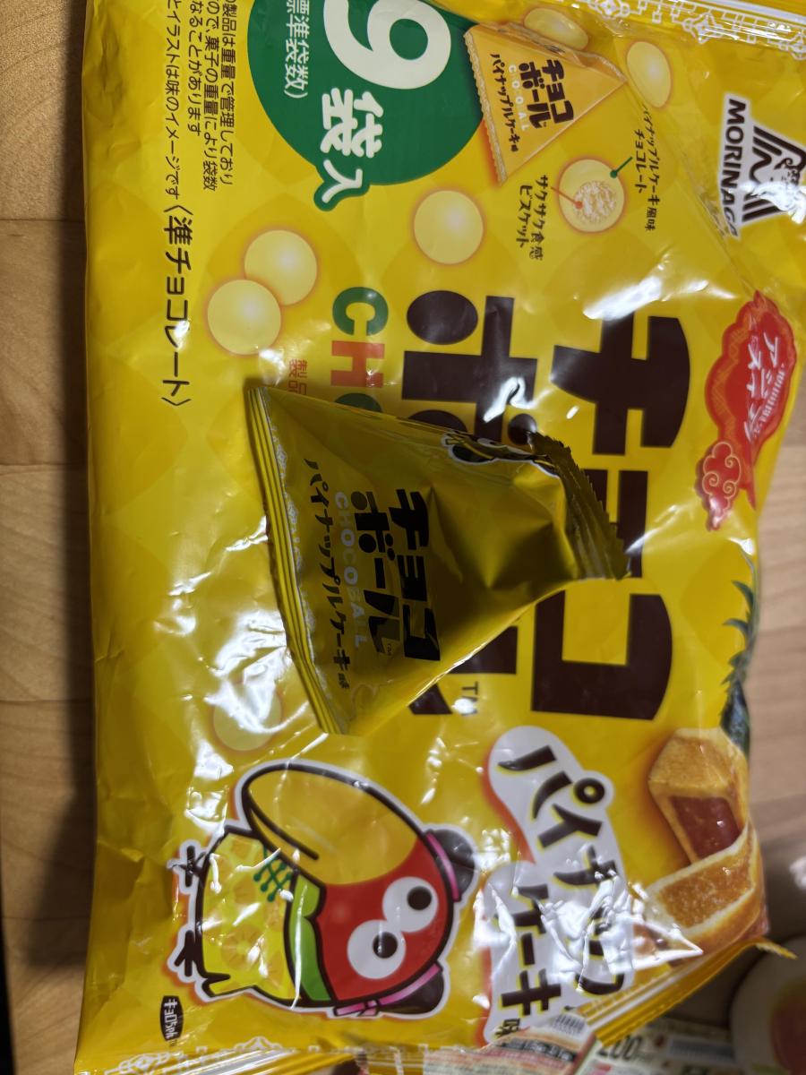 何とも夏らしいパッケージに目が惹き購入してみました。小分けされているのでシェアできて大変便利です。サクサク食感のビスケットは、いつものチョコボールと変わらずの食感でした。パイナップルケーキ味のチョコレートでコーティングされてますが、パイナップル味はほのかな感じで、もう少しパイナップル味強めでもいいかな。