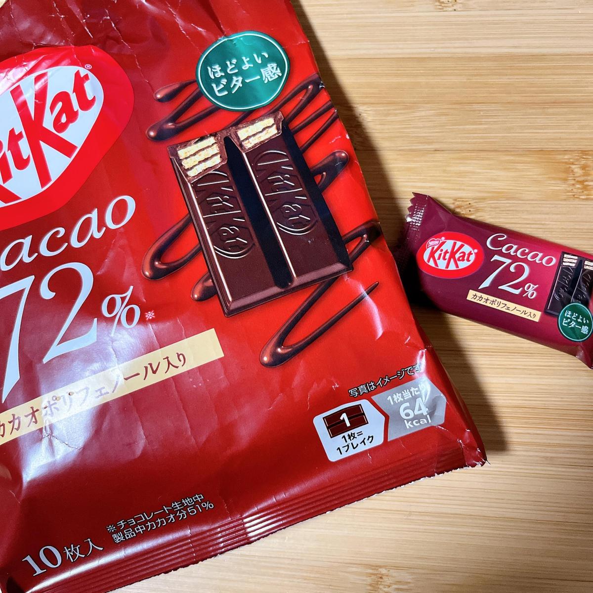 ハイカカオチョコが好きなのでキットカットのカカオ72%を購入しました。ほろ苦い上品なキットカットでじっくりチョコの美味しさを味わえました。ポリフェノールがいっぱい取れるし程よいビター感があり好きです。