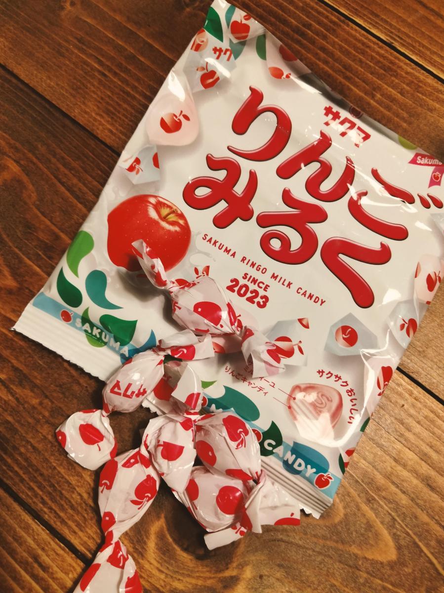 甘酸っぱいりんごキャンディとミルキーなミルフィーユの「りんごみるく」。ほんのり赤く、お祭りのりんご飴のような甘酸っぱくお菓子っぽいりんご味。甘酸っぱさがミルク感のあるミルフィーユと合うし食感と味の変化が楽しい。パッケージもかわいいし個包装の包みフィルムもちゃんとりんご柄でいちごみるく同様唯一無二のおいしさだった!