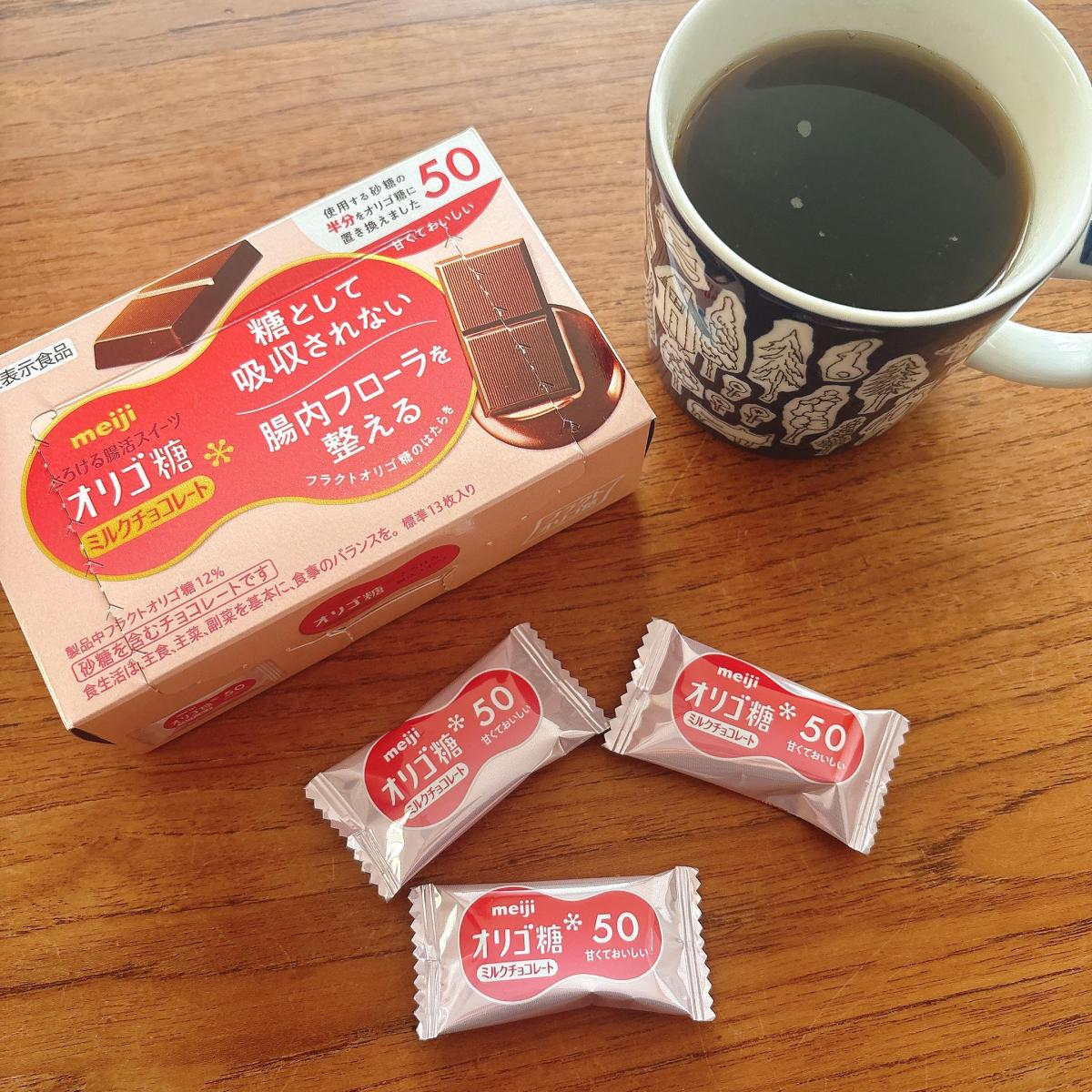 オリゴ糖と砂糖が半分の割合で入っているチョコレート。腸活によいし、カロリーオフ。オリゴ糖は糖として吸収されないそう。