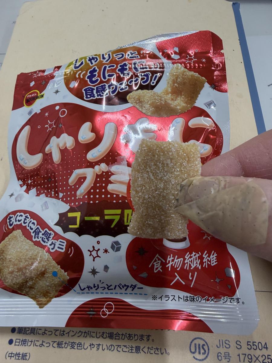 まわりにシャリシャリしたパウダーがまぶしてあり食感が心地よいしゃりもにのコーラバージョンです。コーラの爽やかな味わいと微かな刺激が美味しいです。